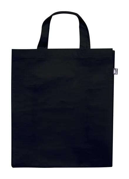 Torba za kupovinu od laminiranog RPET poliestera (110 g/m²) s proširenim, ojačanim dnom, kratkim ručkama i prepoznatljivom RPET etiketom.