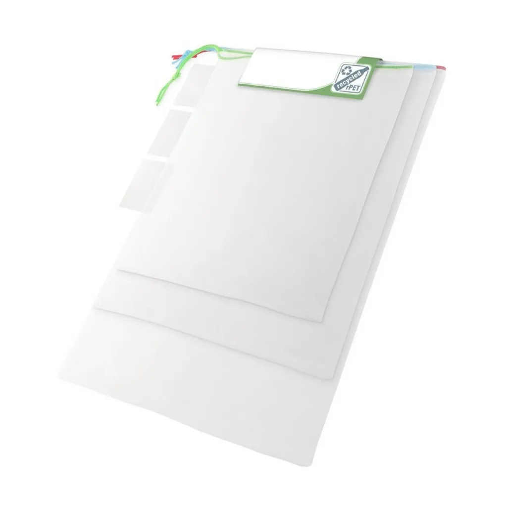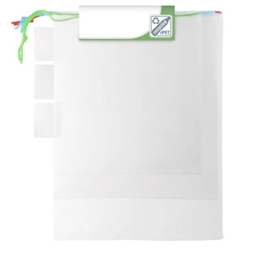 Set od 3 RPET vrećice za voće i povrće različitih veličina: 26x28 cm, 30x33 cm, 30x40 cm. Svaka vrećica dolazi s posebnom etiketom za potrebe tiska.