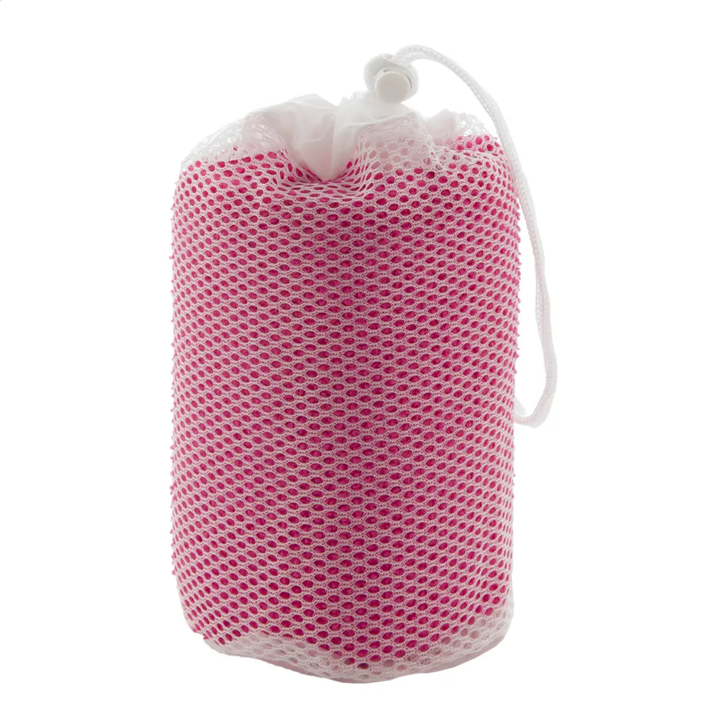 Sportski ručnik od mikrofibre težine 185gr/m², umotan u mrežastu vrećicu.