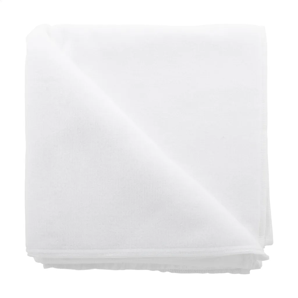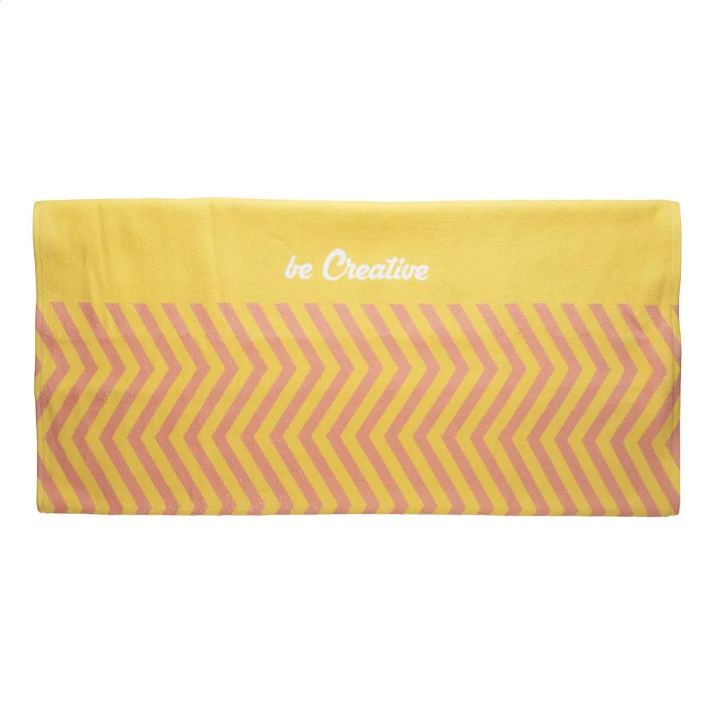 Dvostrani ručnik sa sublimacijskim tiskom na jednoj strani. Materijal: 100% pamuk + 100% mikrofibra, težine 400 g/m². Isporučuje se zarolan s digitalno otisnutim papirnatim držačem. Sublimacijski i digitalni tisak uključeni u cijenu. Minimalna količina narudžbe: 25 komada.