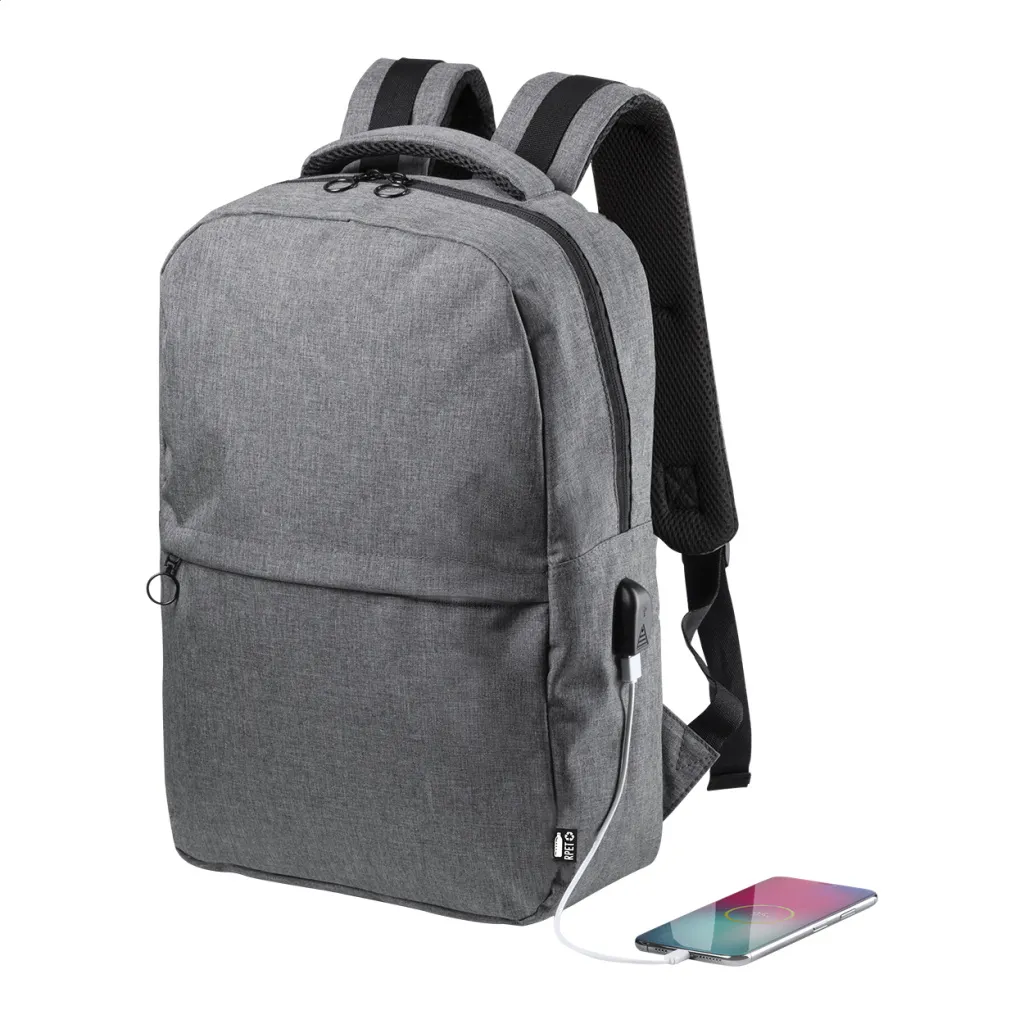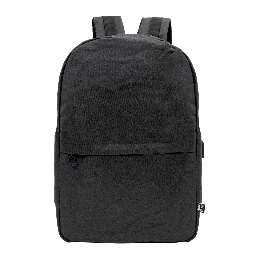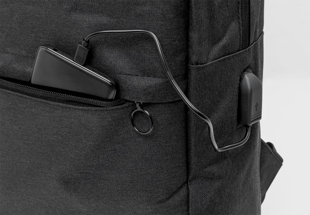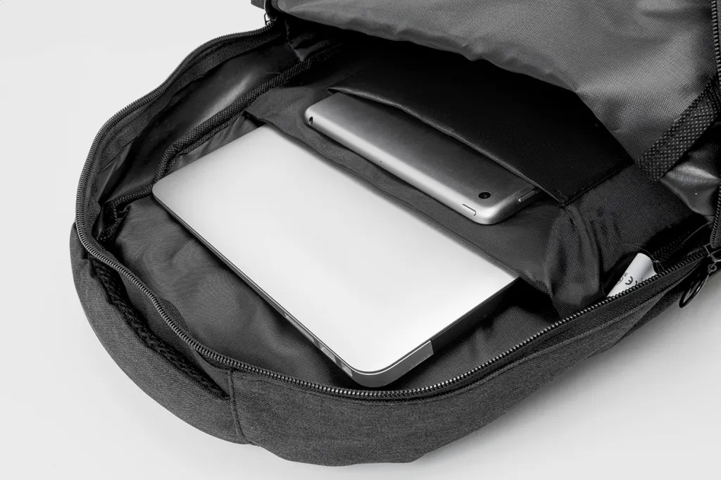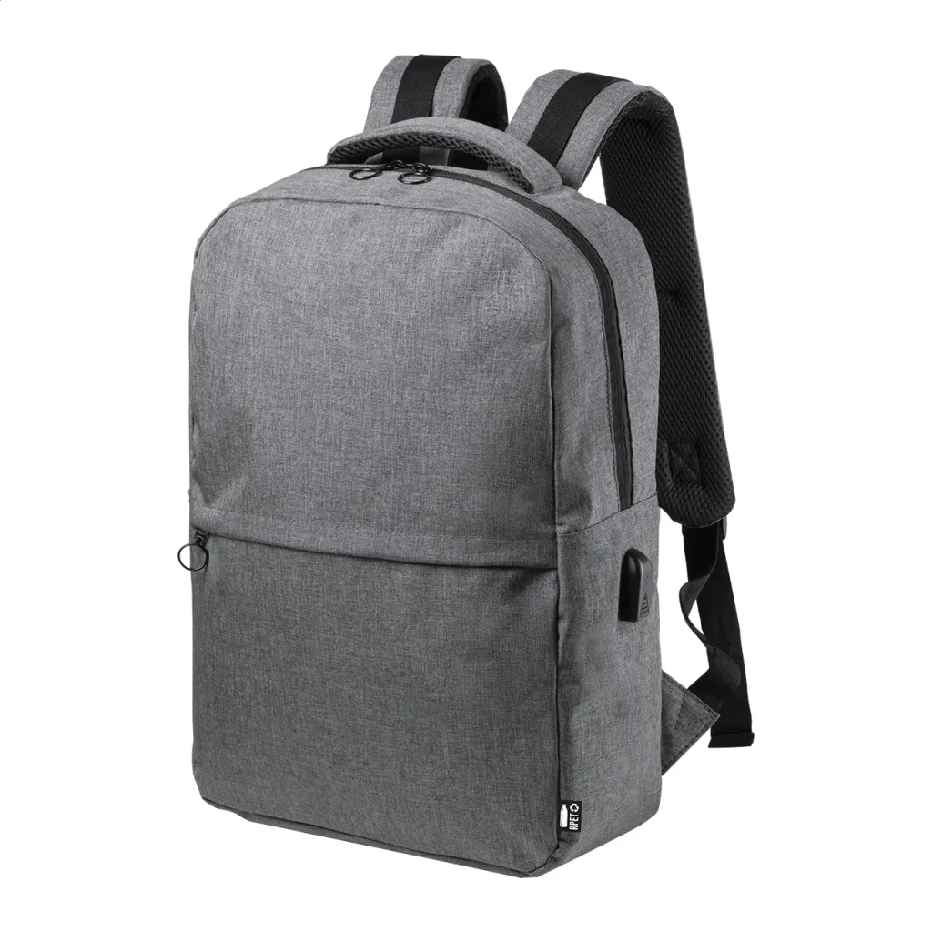 Ruksak s pretincima na patentno zatvaranje te podstavljenim stražnjim dijelom, naramenicama i odjeljcima za laptop (15") i tablet (10"). Sadrži USB priključak za prijenosnu bateriju. Reciklirani PET (rPET) polyester.