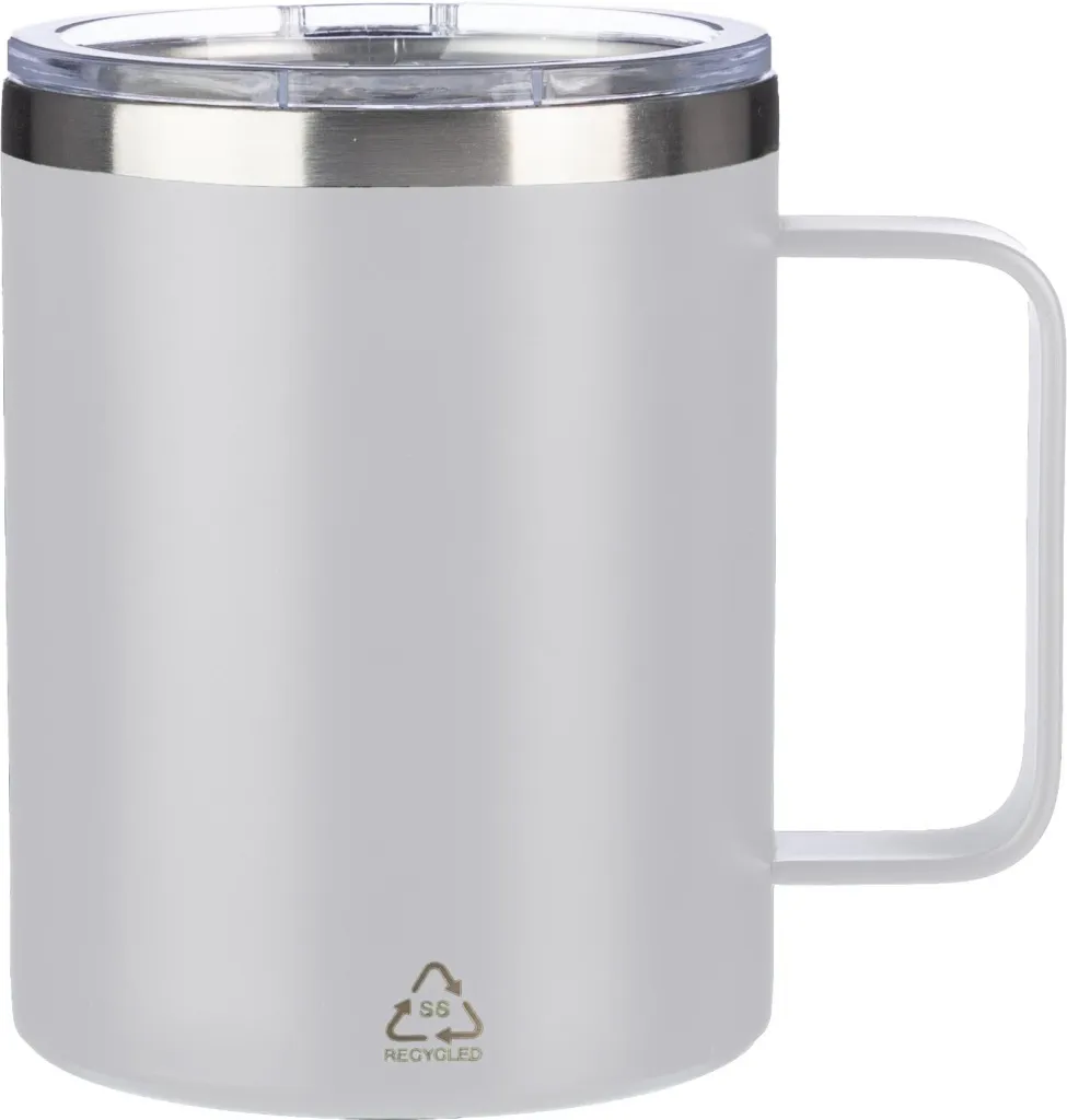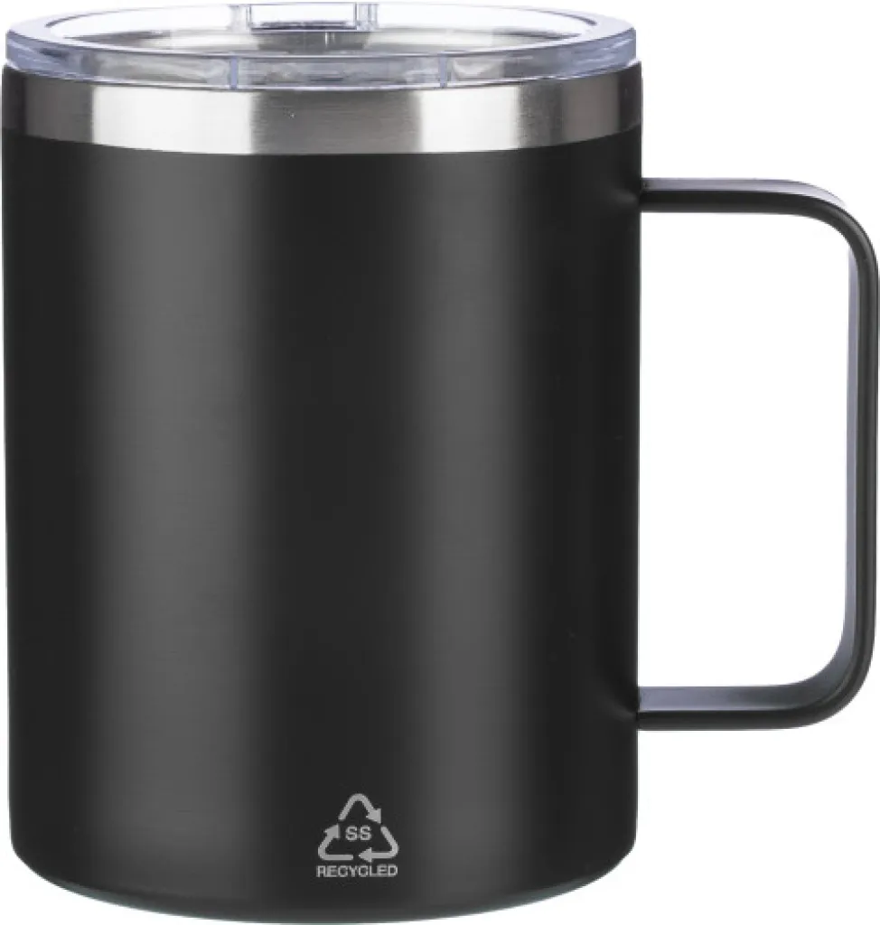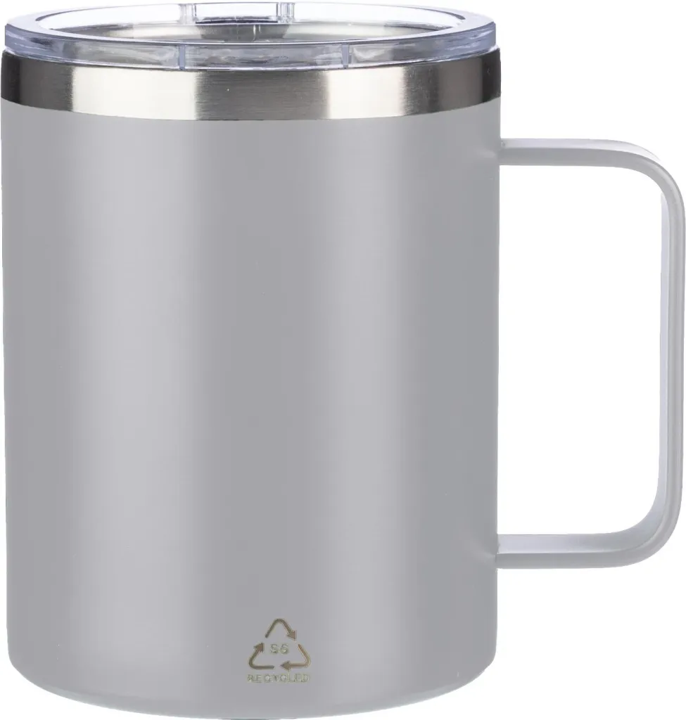Šalica za piće od nehrđajućeg čelika s dvostrukim stijenkama (S/S304) (300 ml) s mat završnom obradom. PS poklopac na gornjoj strani sa zatvaračem. Uključuje logotip za reciklirani nehrđajući čelik na prednjoj strani šalice. Pojedinačno pakirano u smeđu kartonsku kutiju.