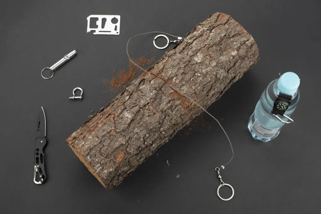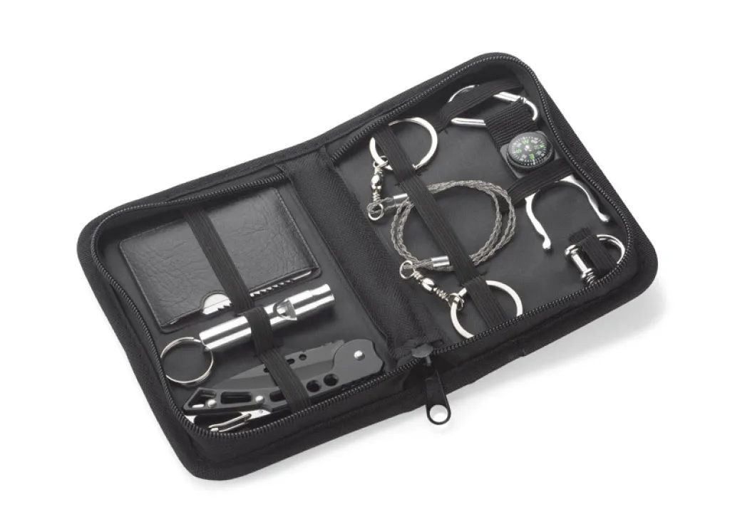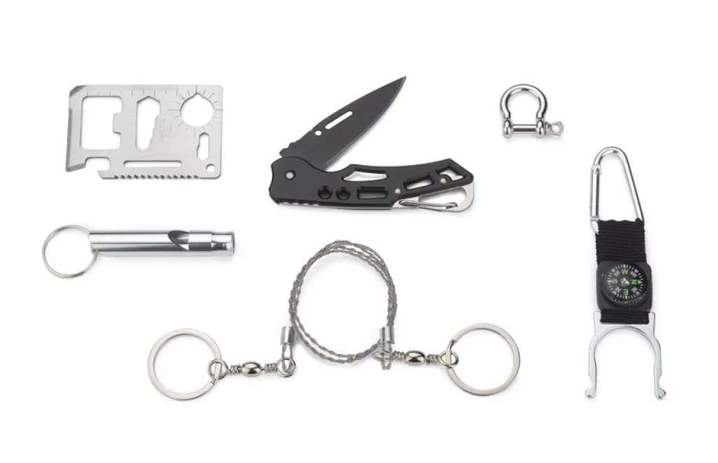 Set alata BALE nužan je za ljubitelje boravka na otvorenom. U jednom kompletu pronaći ćete sve što vam može poslužiti tijekom mnogih putovanja. Set se sastoji od šest elemenata: držača za boce s karabinom i kompasom, ručne lančane pile, sklopivog noža, zviždaljke, gambeta i višenamjenske kartice s čak 11 funkcija: otvarač za boce i limenke, odvijač, ravnalo od 4 cm, ključ s 4 pozicije za različite veličine matica ili vijaka, leptir otvarač, dvoredna pila, indikator za karte, dvostruki ključ i otvor za vezicu ili ključeve. Set je zapakiran u crnu kutiju.
