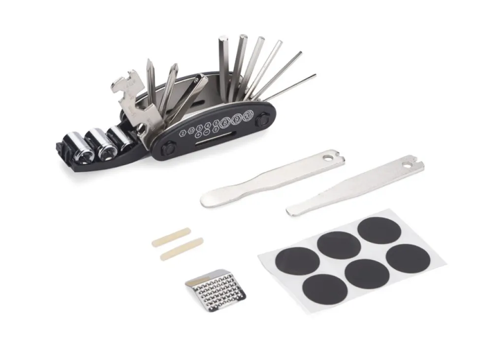 LEROY set alata za bicikle neophodan je set alata za svakog ljubitelja biciklizma. Zahvaljujući raznim alatima, možete izvršiti gotovo sve potrebne popravke na cesti ili kod kuće. To je kompaktan set koji uključuje: set imbus ključeva, nasadne vijke, odvijače, univerzalni ključ, žlice za gume i zakrpe za popravak zračnica. Sve zapakirano u crnu futrolu.