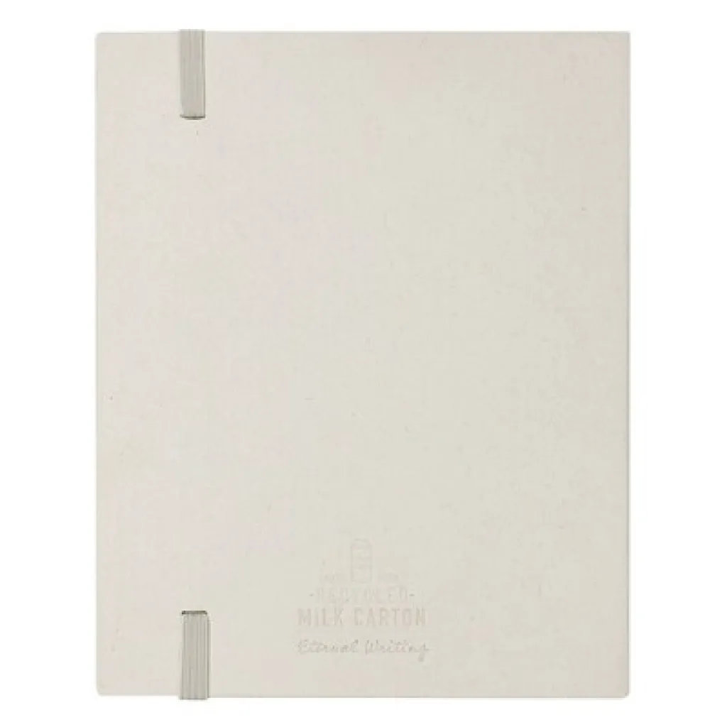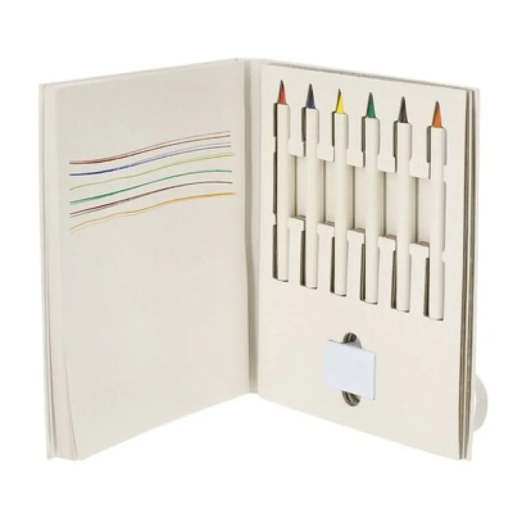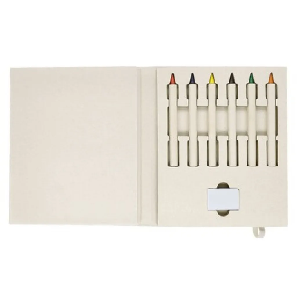 Set od šest olovaka u boji, gumica za brisanje, blok s 50 praznih stranica, dodatna elastična traka za zatvaranje u odgovarajućoj boji. Proizvod izrađen od recikliranih tetrapaka za mlijeko. Uključuje ikonu recikliranih tetrapaka za mlijeko.