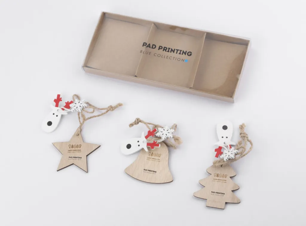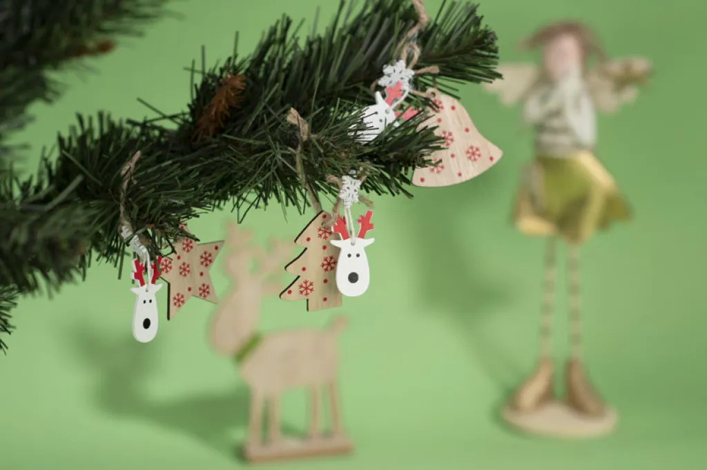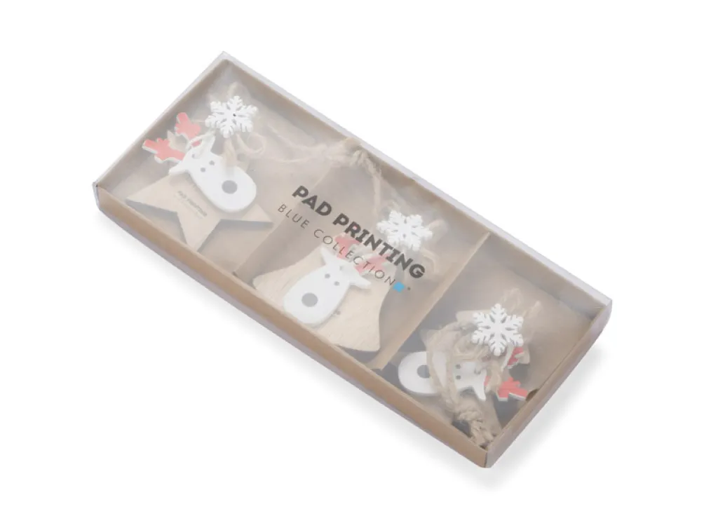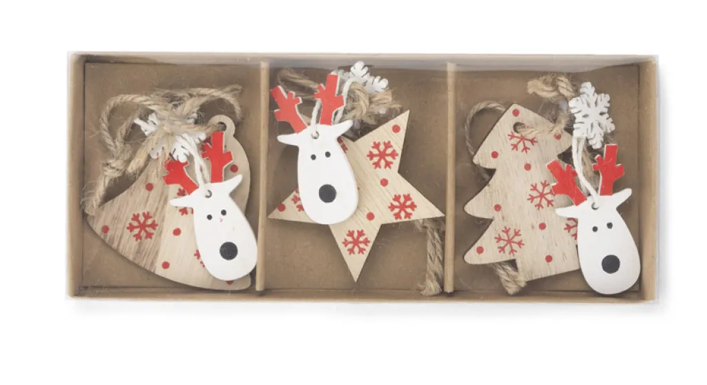 FERI set se sastoji od 3 komada ukrasa za bor različitih oblika: zvijezda, božićno drvce i zvono. Drveni božićni ukrasi savršeno se uklapaju u ekološki trend, pristajući uz gotovo svaki interijer.