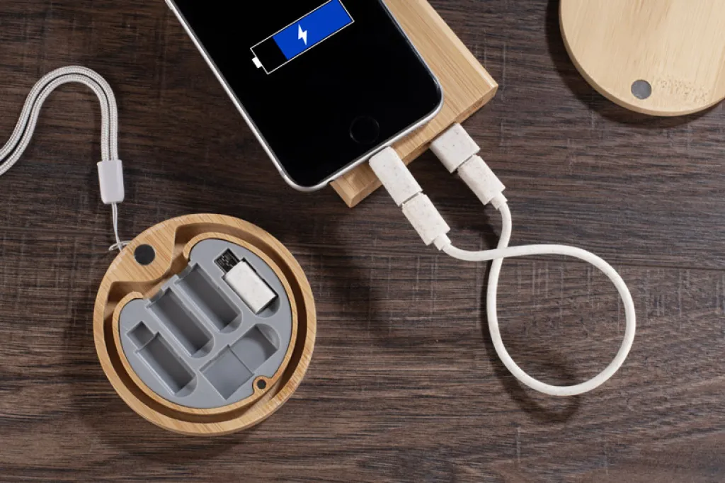 Set kabela za punjenje MIJATO dolazi u elegantnoj okrugloj kutiji od bambusa. Kabeli imaju i funkciju punjenja i prijenosa podataka. Set uključuje 4 vrste terminala: USB tip C, USB, micro USB i adapter kompatibilan s iOS uređajima. Izrađene su od pšenične slame.