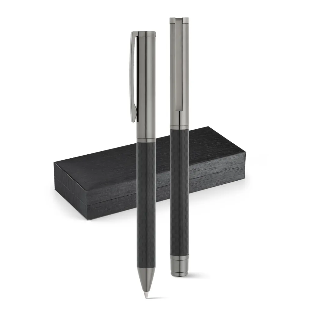 Set uključuje kemijsku olovku i metalnu roler olovku. Kemijska olovka ima plavu tintu dok roler olovka ima crnu tintu. Predstavljene su u poklon kutiji. DImenzije olovke: ø10 x 135 mm | Dimenzije kutije: 185 x 75 x 31 mm.