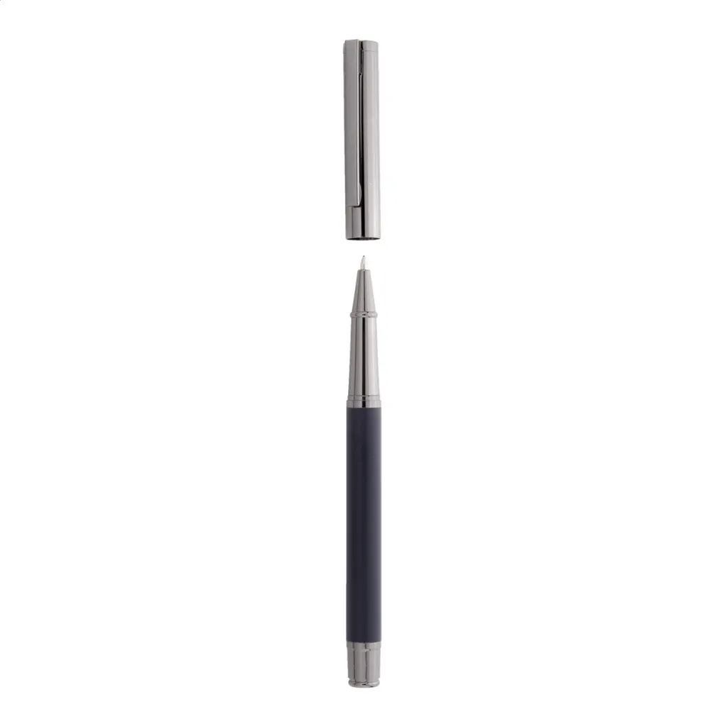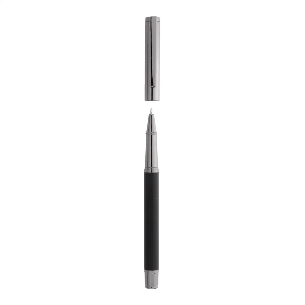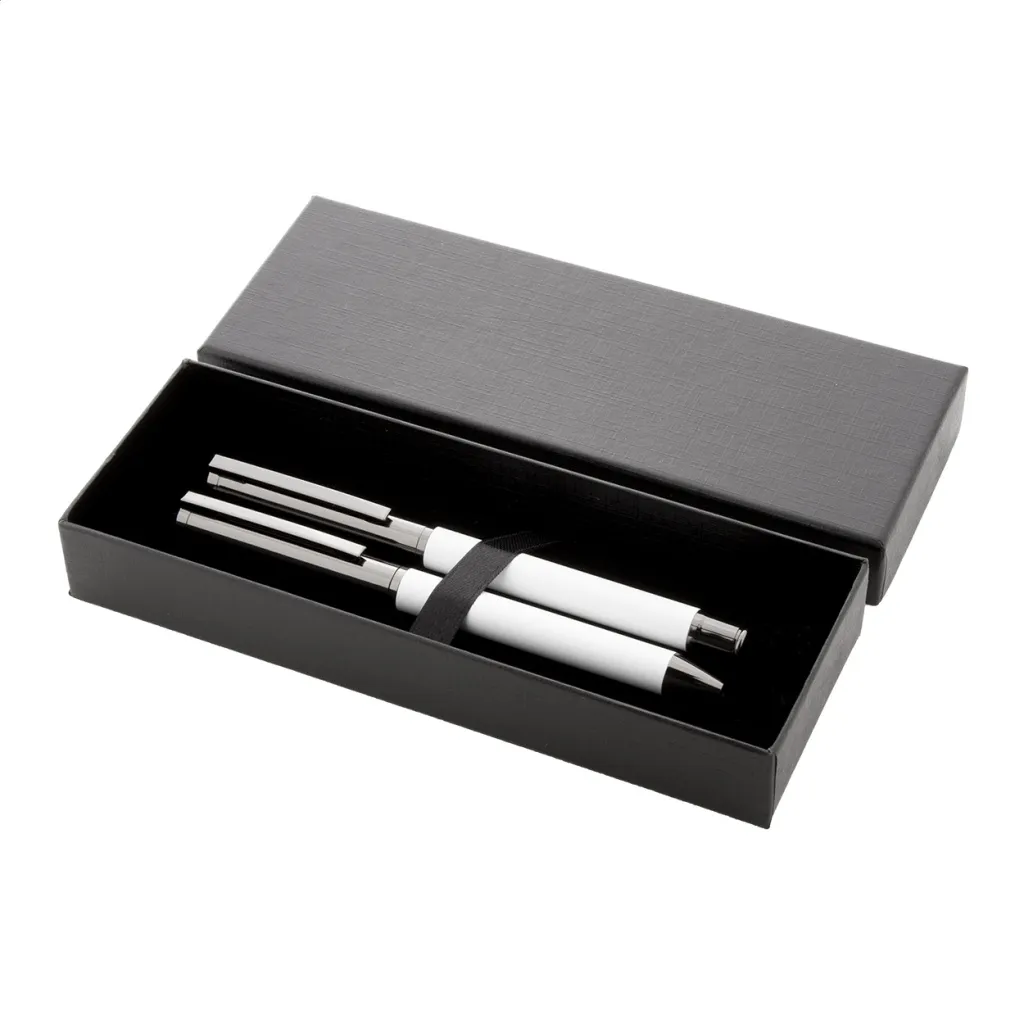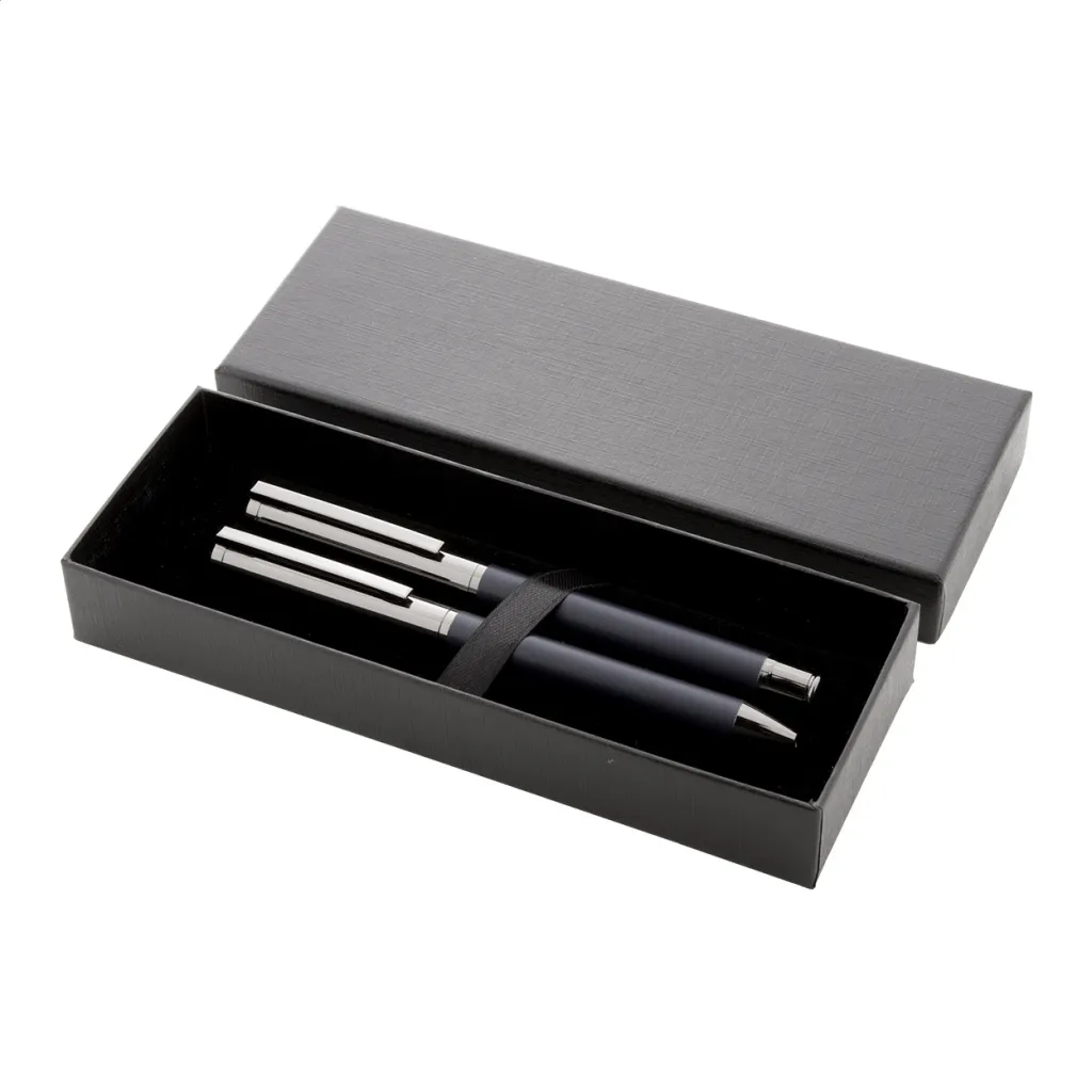 Elegantni metalni set sastoji se od kemijske olovke i roller kemijske olovke s plavim punjenjem. Dolaze u crnoj papirnoj poklon kutijici.