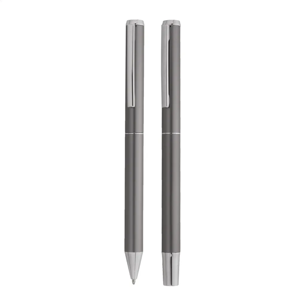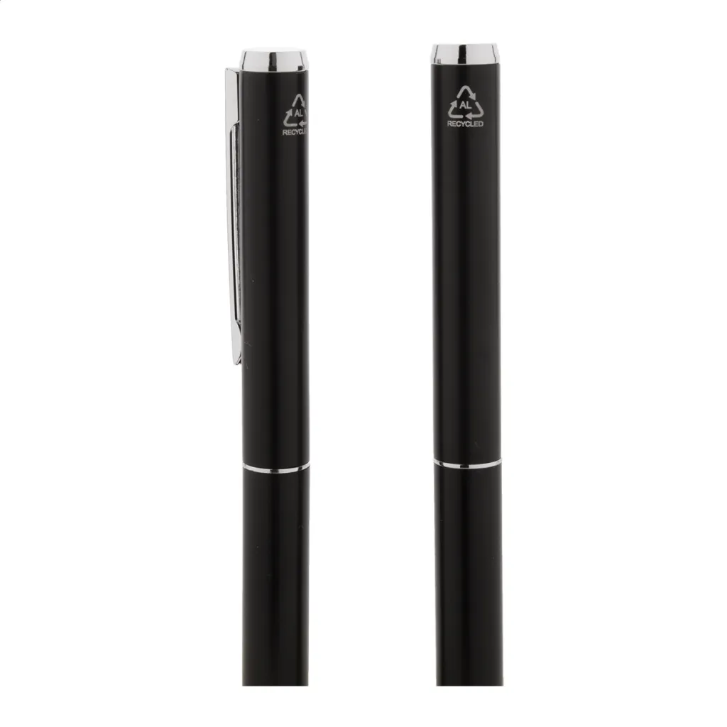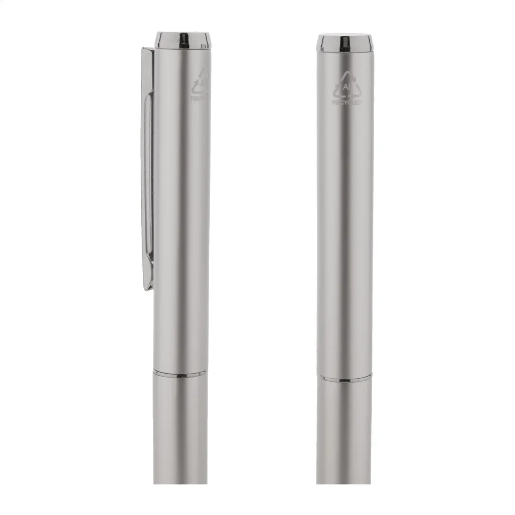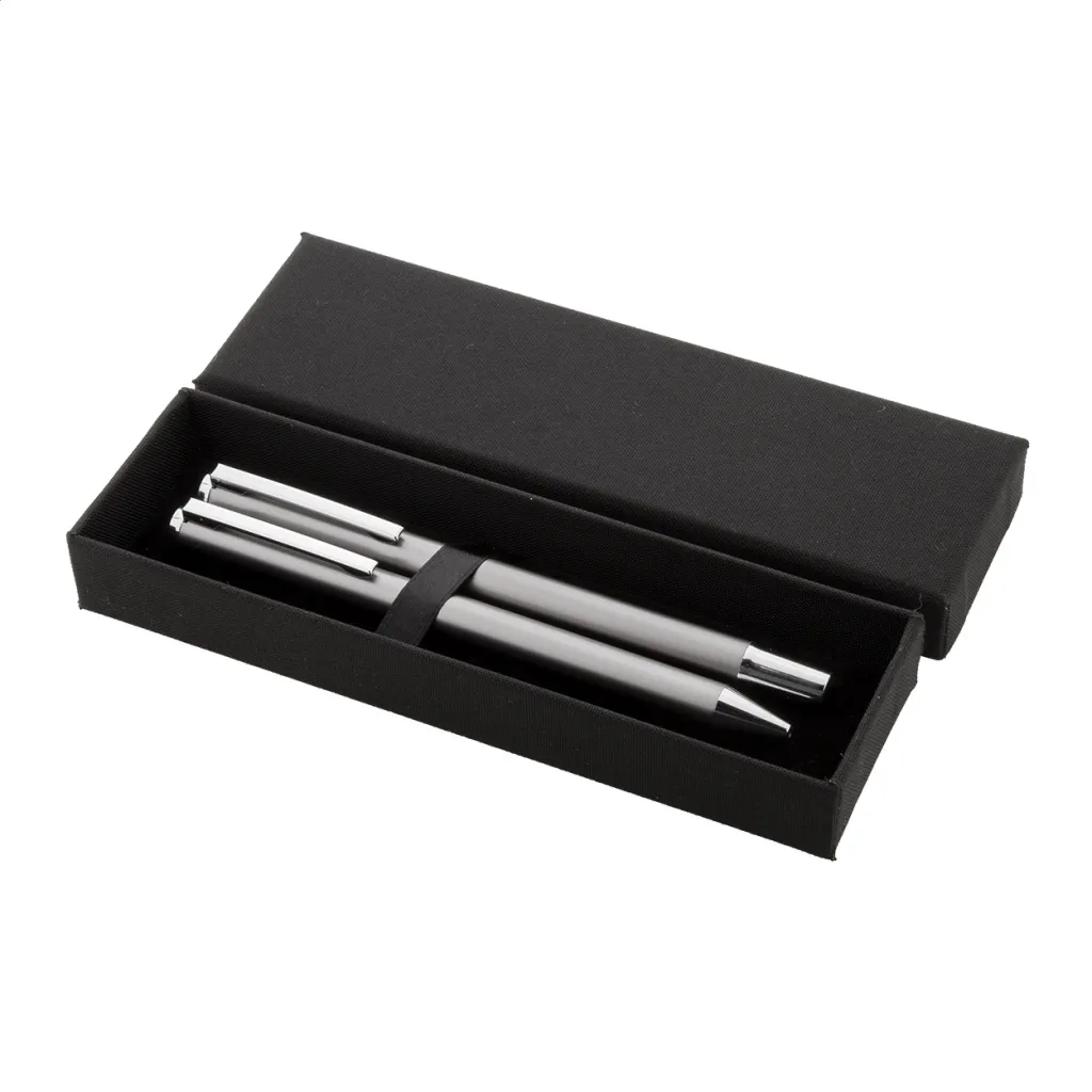 Set se sastoji od kemijske olovke i roller kemijske olovke izrađene od recikliranog aluminija, s plavim punjenjem. Dolaze u crnoj papirnoj poklon kutijici.