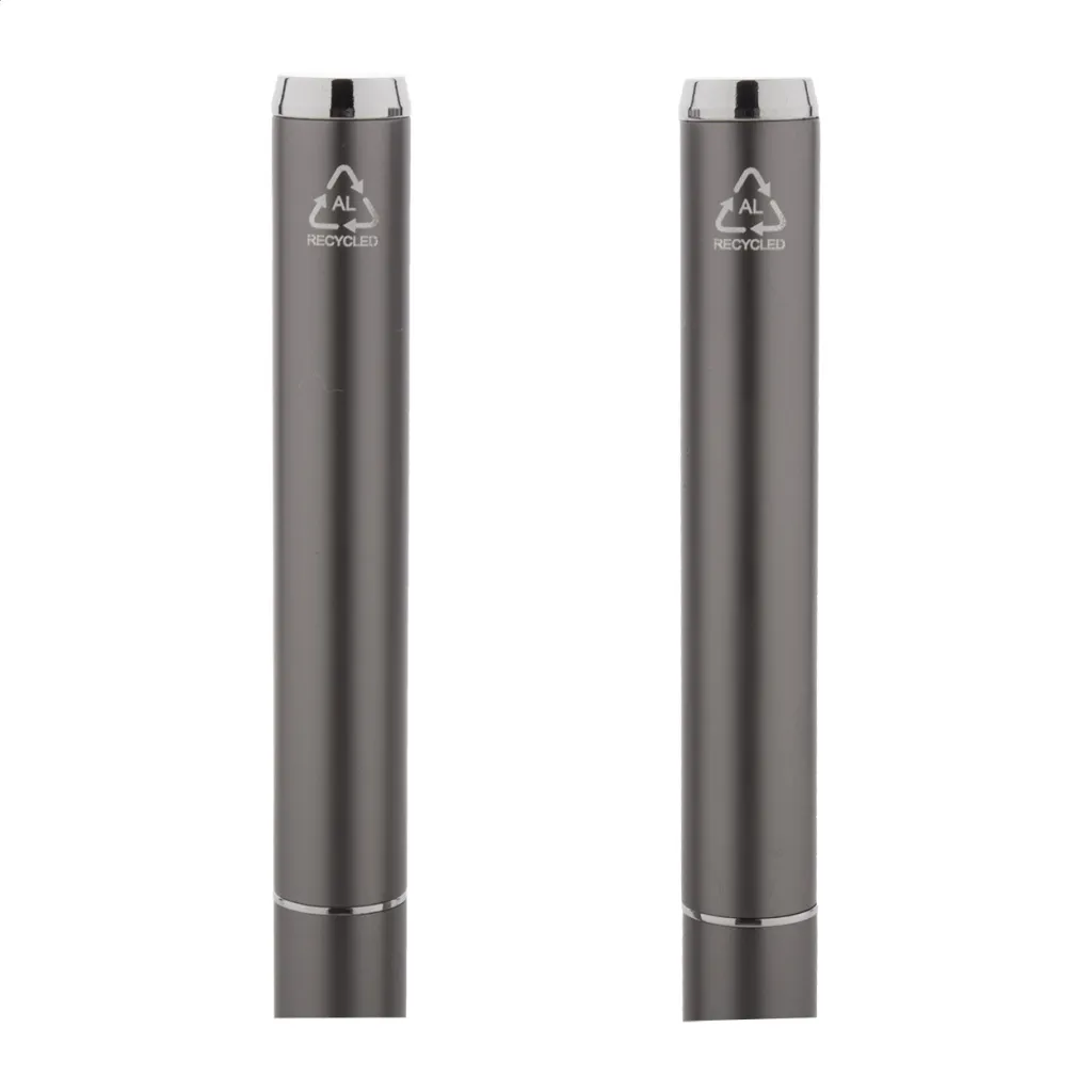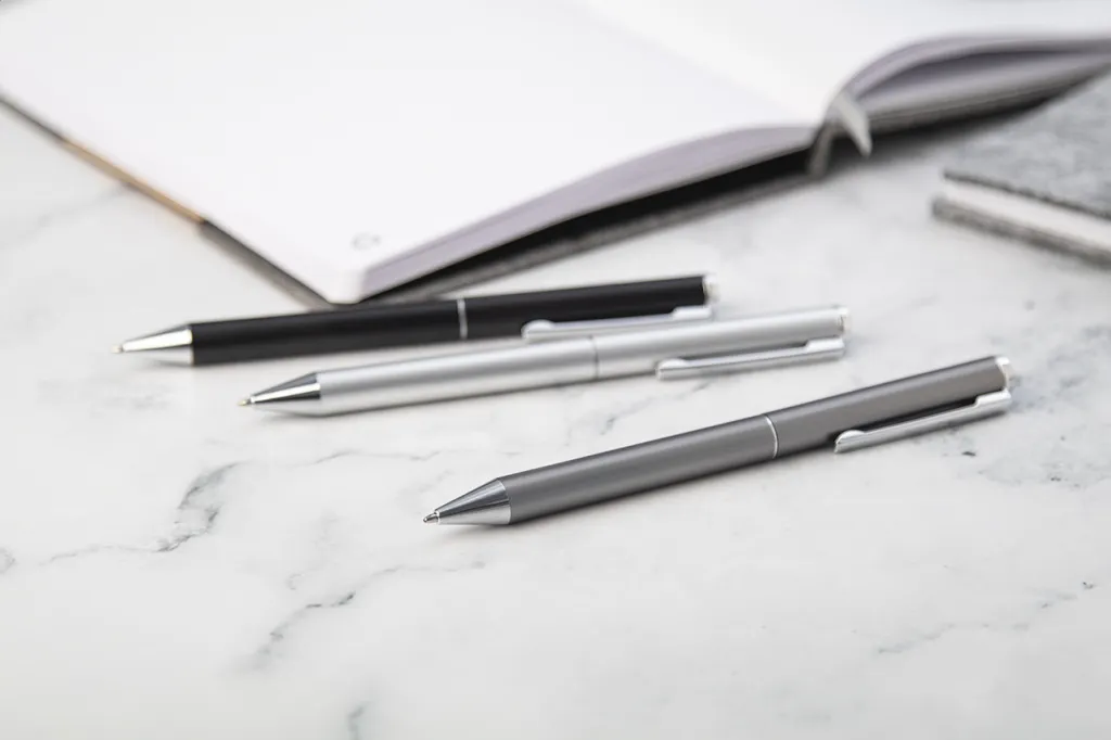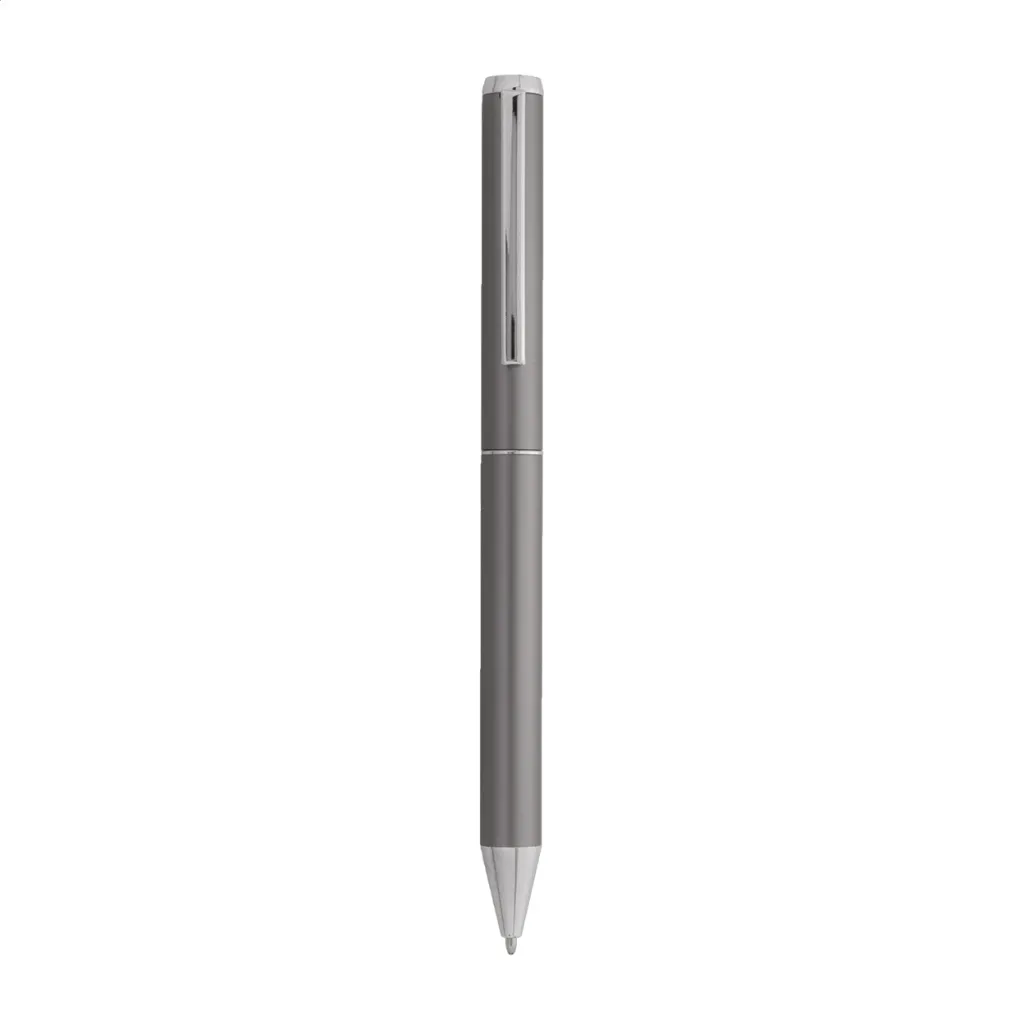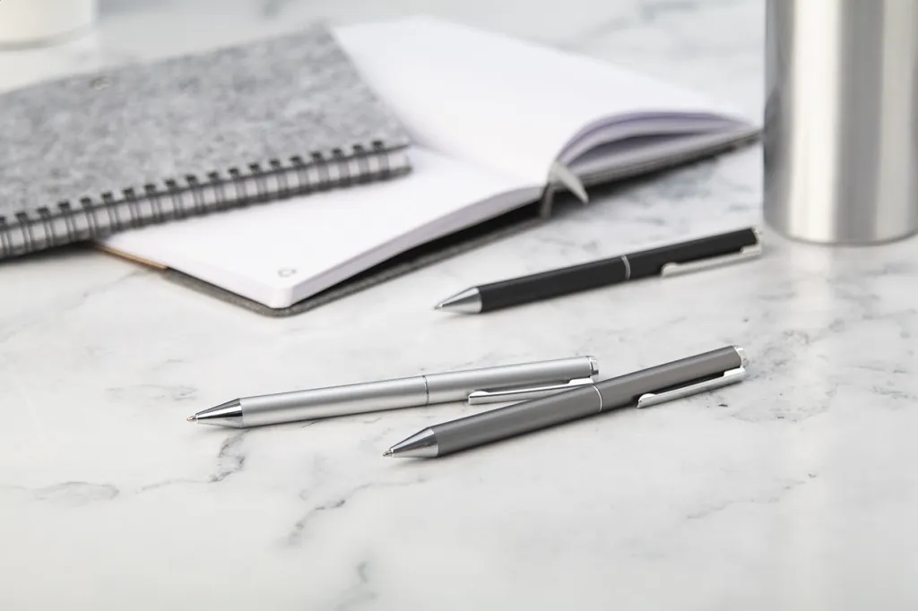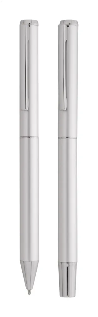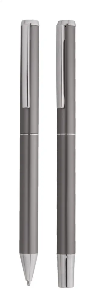 Set se sastoji od kemijske olovke i roller kemijske olovke izrađene od recikliranog aluminija, s plavim punjenjem. Dolaze u crnoj papirnoj poklon kutijici.