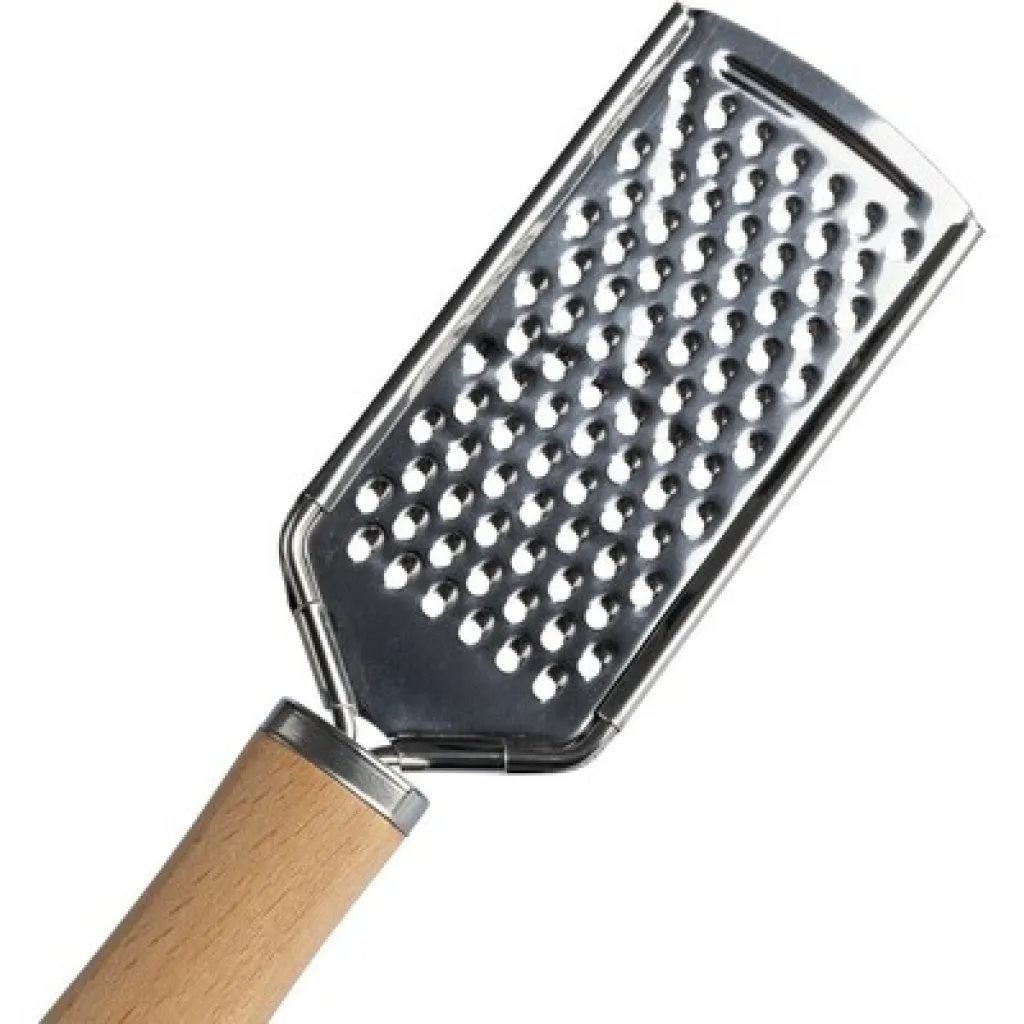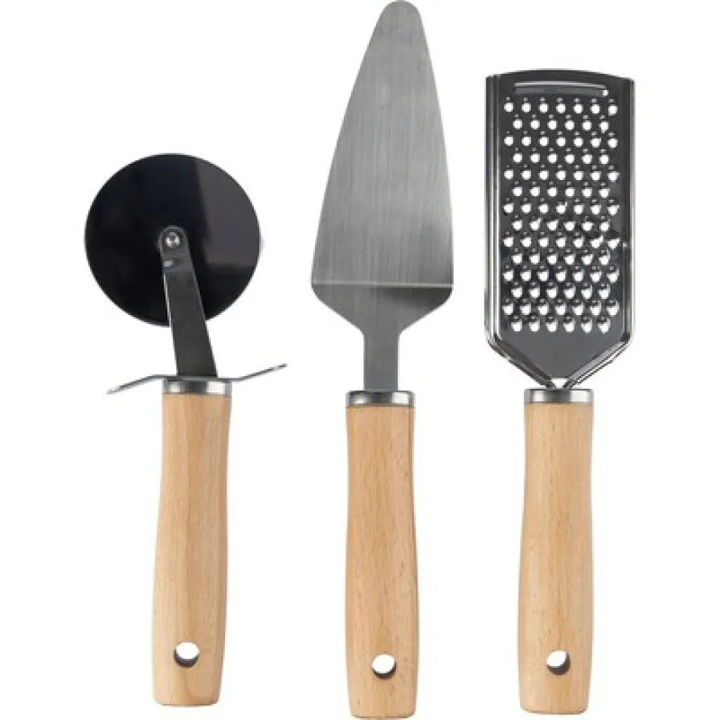 Set kuhinjskih dodataka koji uključuje ribež od nehrđajućeg čelika, žlicu za pite i rezač za pizzu, svaki s drvenom drškom. Nije prikladno za pranje u perilici posuđa. Pakiran je u pamučnu vrećicu s vezicom za zatvaranje. Proizvod je izrađen od metala i drva.