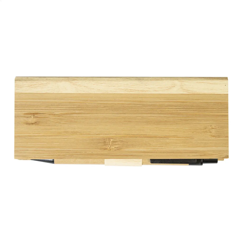 Set s 220 ljepljivih bilješki (u dvije različite boje) i 550 markera za stranice (u pet različitih boja) u kutijici od bambusa. Uključuje ravnalo od 12 cm i olovku od recikliranog kartona s plavim punjenjem.