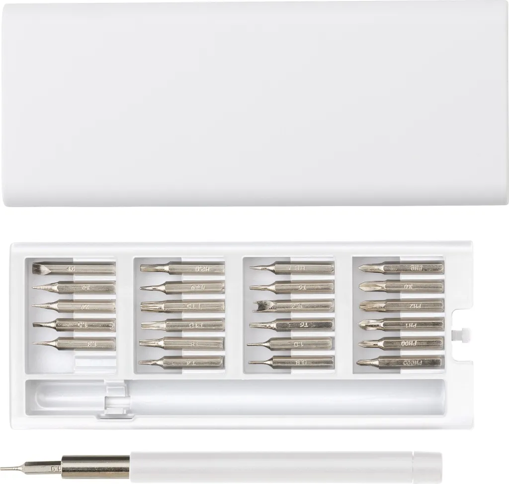 Set odvijača od ABS-a i metala s 24 precizna bitova. Drška odvijača ima magnet koji drži bitove na mjestu i olakšava zamjenu jednog bita za drugi. Pritiskom na kraj, ladica s bitovima izlazi iz kućišta.