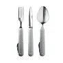 Set pribora za jelo za kampiranje od nehrđajućeg čelika s aluminijskom ručkom. Set žlica, vilica i nož dolaze isporučeni u crnoj torbici.