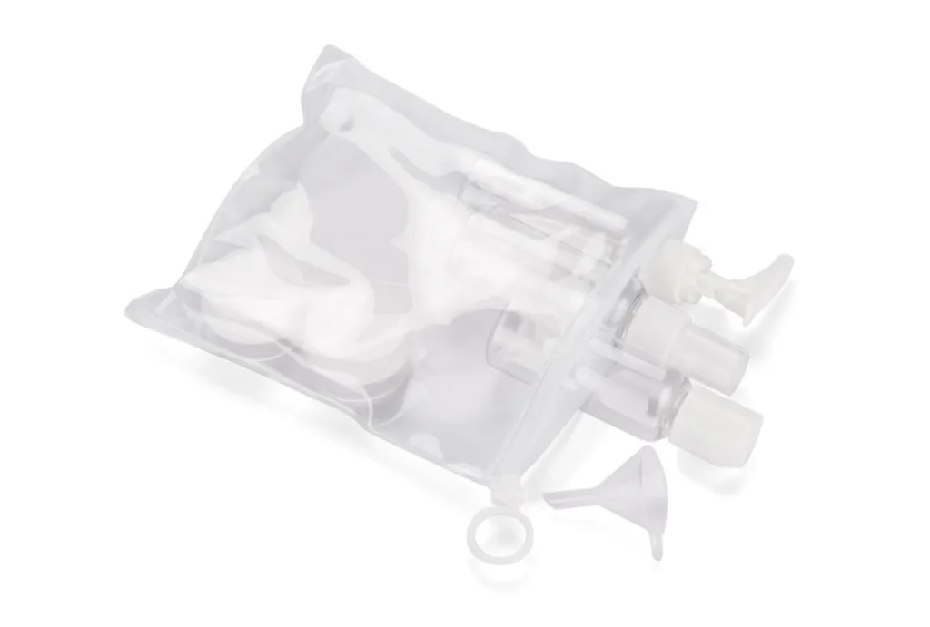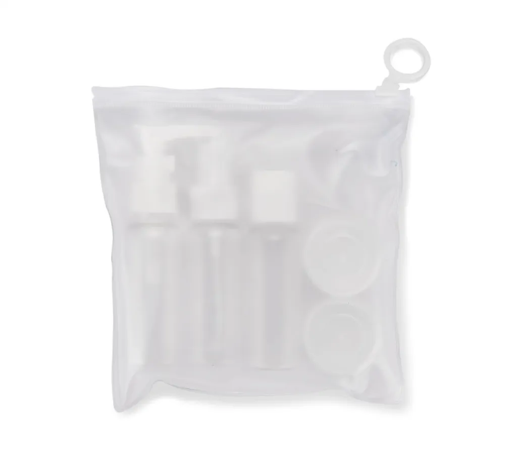Praktičan AIRO putni set bočica omogućuje praktično i higijensko skladištenje kozmetike tijekom putovanja. Sastoji se od: bočice s raspršivačem, bočice s pumpicom, bočice s zatvaračem i dvije staklenke. Priloženi lijevak olakšava precizno izlijevanje tekućine, a žlica je idealna za nanošenje slojeva kremaste kozmetike. Prozirni spremnici s bijelim čepovima olakšavaju prepoznavanje sadržaja. U kompletu se nalazi i torbica, s jedne strane prozirna, s druge mliječne boje, koja se zatvara na patentni zatvarač. Kompaktna veličina kontejnera udovoljava zahtjevima zrakoplovnih prijevoznika.