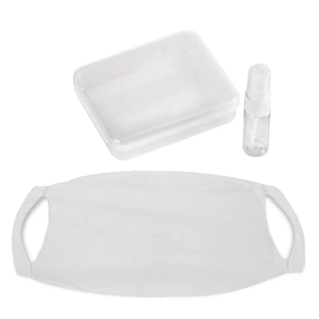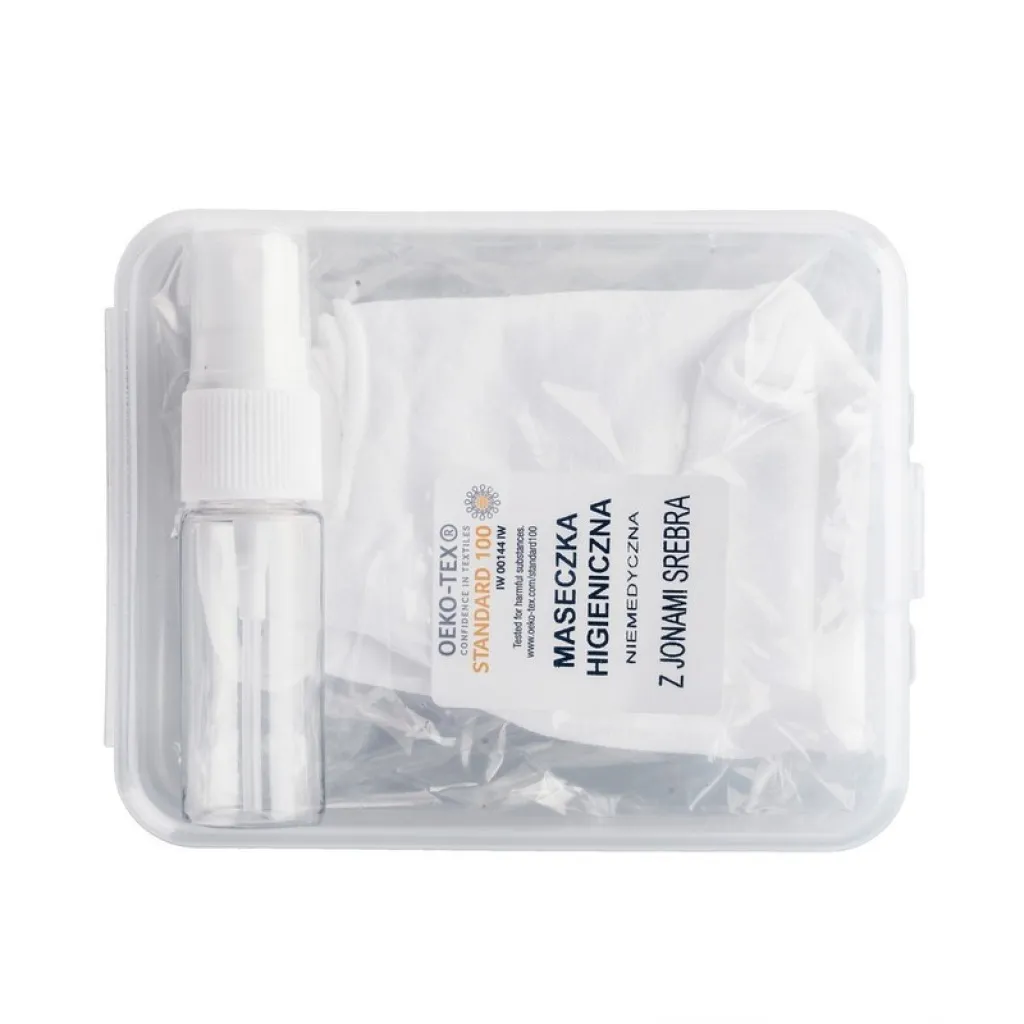 Set u kutiji uključuje bočicu s raspršivačem od 15 ml za dezinficijens i masku za lice s ionima srebra i mjestom za filter - nemedicinska, za višekratnu upotrebu, od 100% poliamida 250 g/m2; ioni srebra traju do 20 pranja, temperatura pranja do 90 stupnjeva Celzijusa, maska proizvedena u Poljskoj.