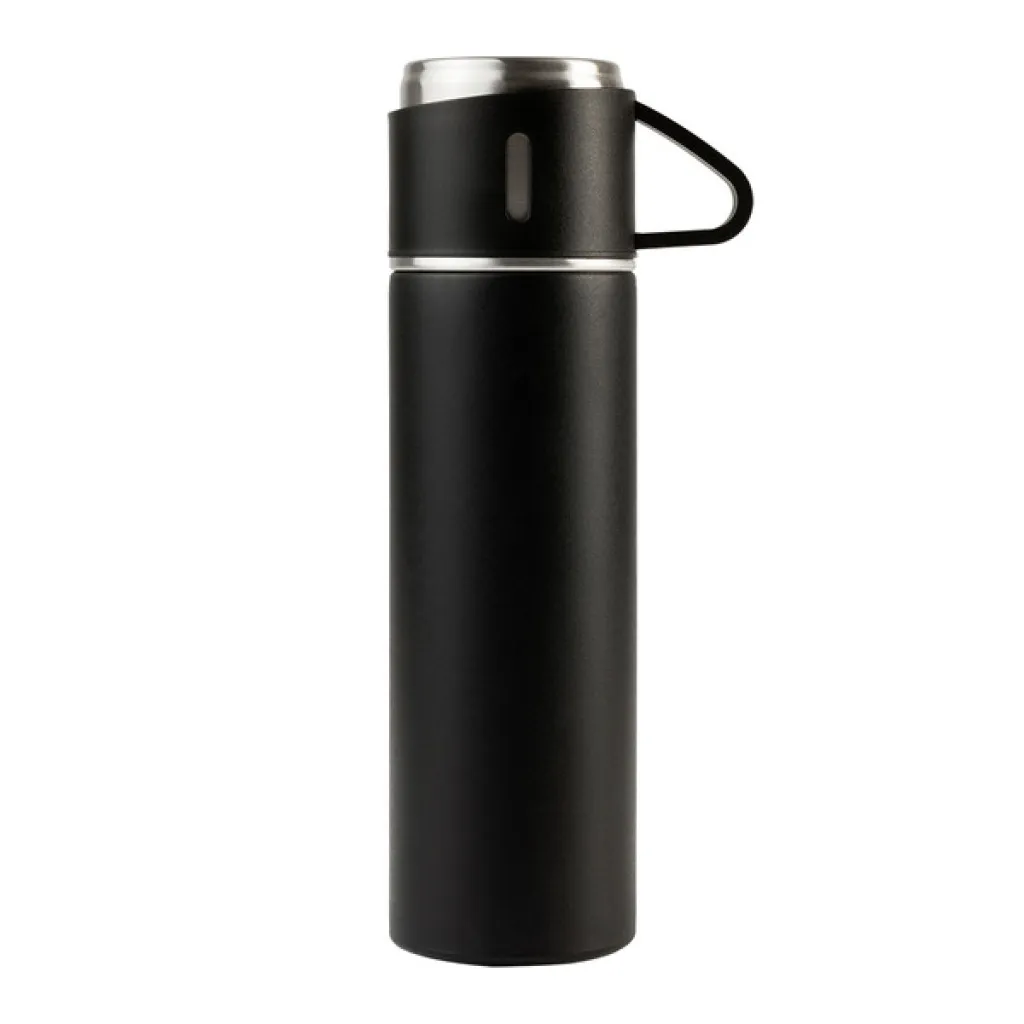 Vakuumska boca od 500 ml s tri čaše. Praktičan set za planinarenje i putovanja s prijateljima ili obitelji. Vakuumska boca: Š100 x V235 x D67 mm, šalica: Š100 x V56 x D67 mm.