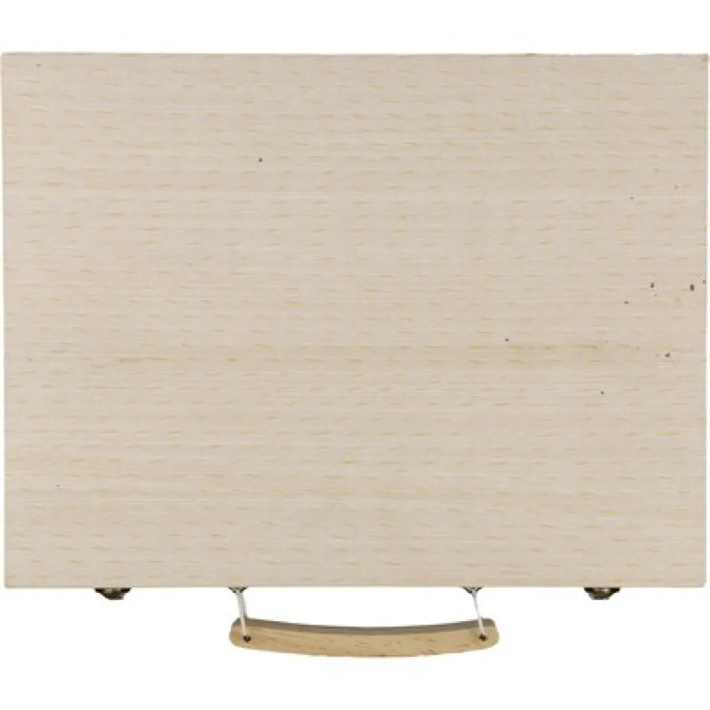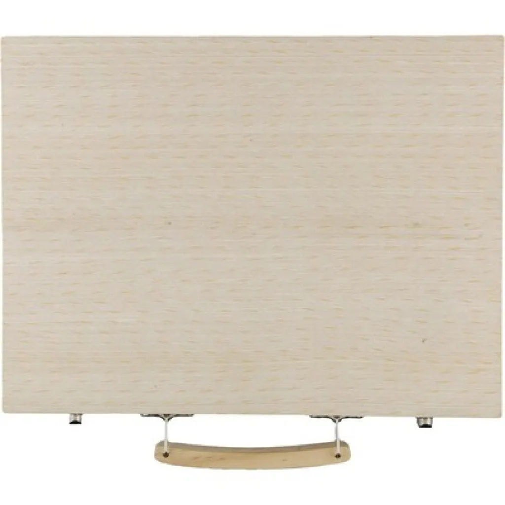 Set za crtanje s drvenom kutijom od borove šperploče i drvenom ručkom, sadrži 66 dijelova: 12 voštanih bojica, 12 obojenih olovaka (naoštrenih), 12 flomastera, 12 uljanih bojica, štapić ljepila, gumicu, oštrilo, ravnalo, kist, 12 boja, paletu, pakirano pojedinačno u smeđu kartonsku kutiju.