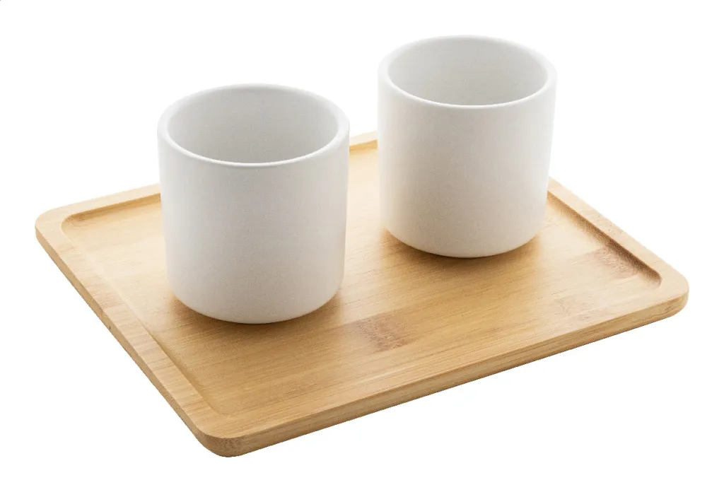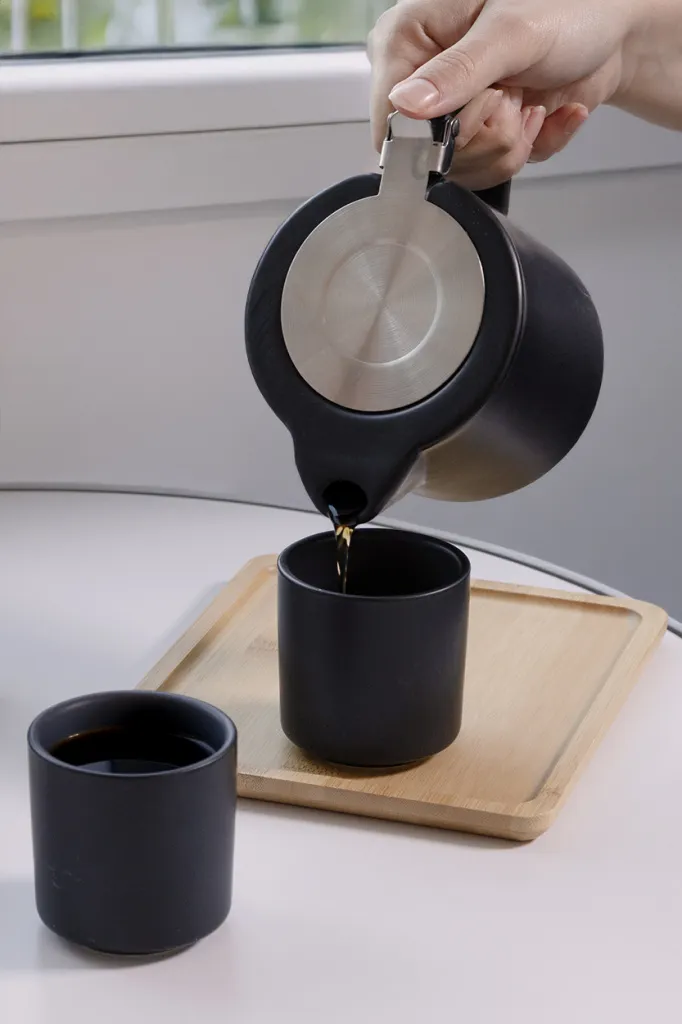 Visokokvalitetni keramički set za čaj s mat završnom obradom i bambusovim pladnjem za posluživanje. Uključuje čajnik (500 ml) s poklopcem od nehrđajućeg čelika i cjedilom za čaj te dvije šalice (150 ml). U kutiji od natron papira.