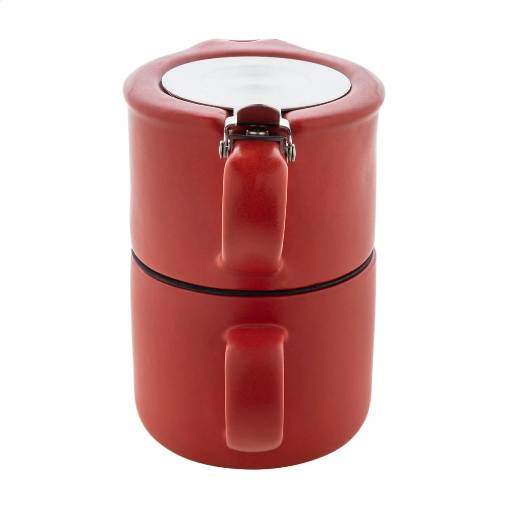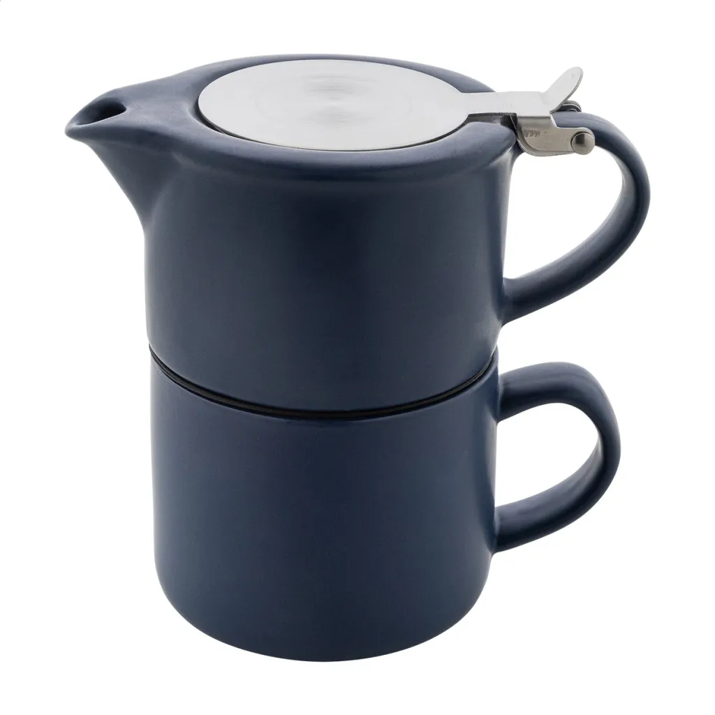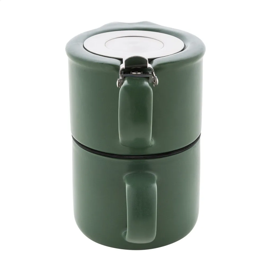 Visokokvalitetni keramički set za čaj s mat završnom obradom i bambusovim pladnjem za posluživanje. Uključuje čajnik (430ml) s poklopcem od nehrđajućeg čelika i cjedilom za čaj te dvije šalice (400 ml). U kutiji od natron papira.