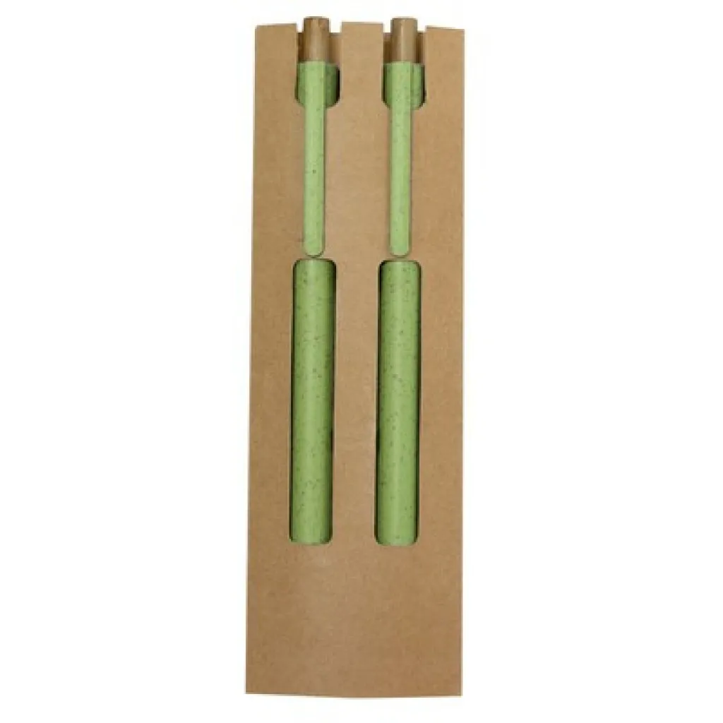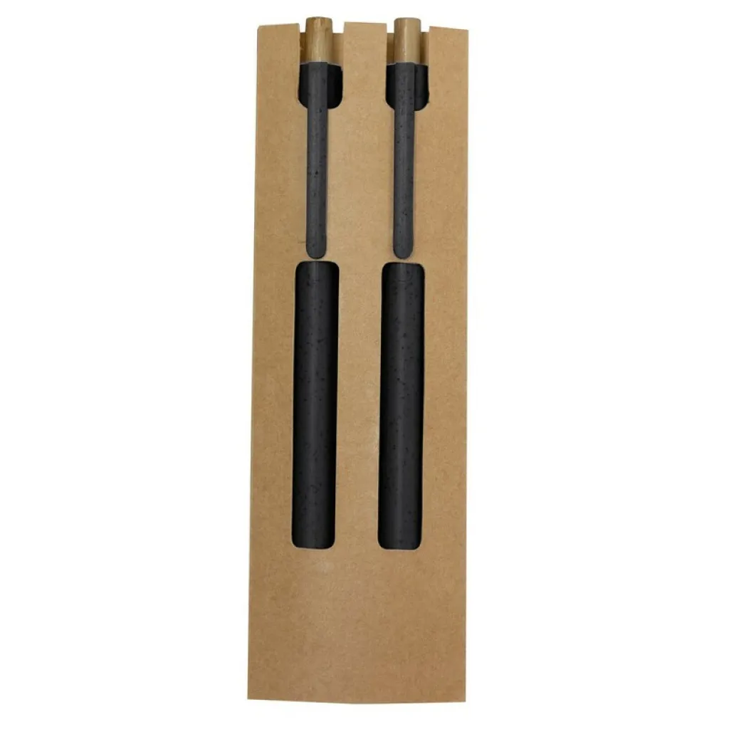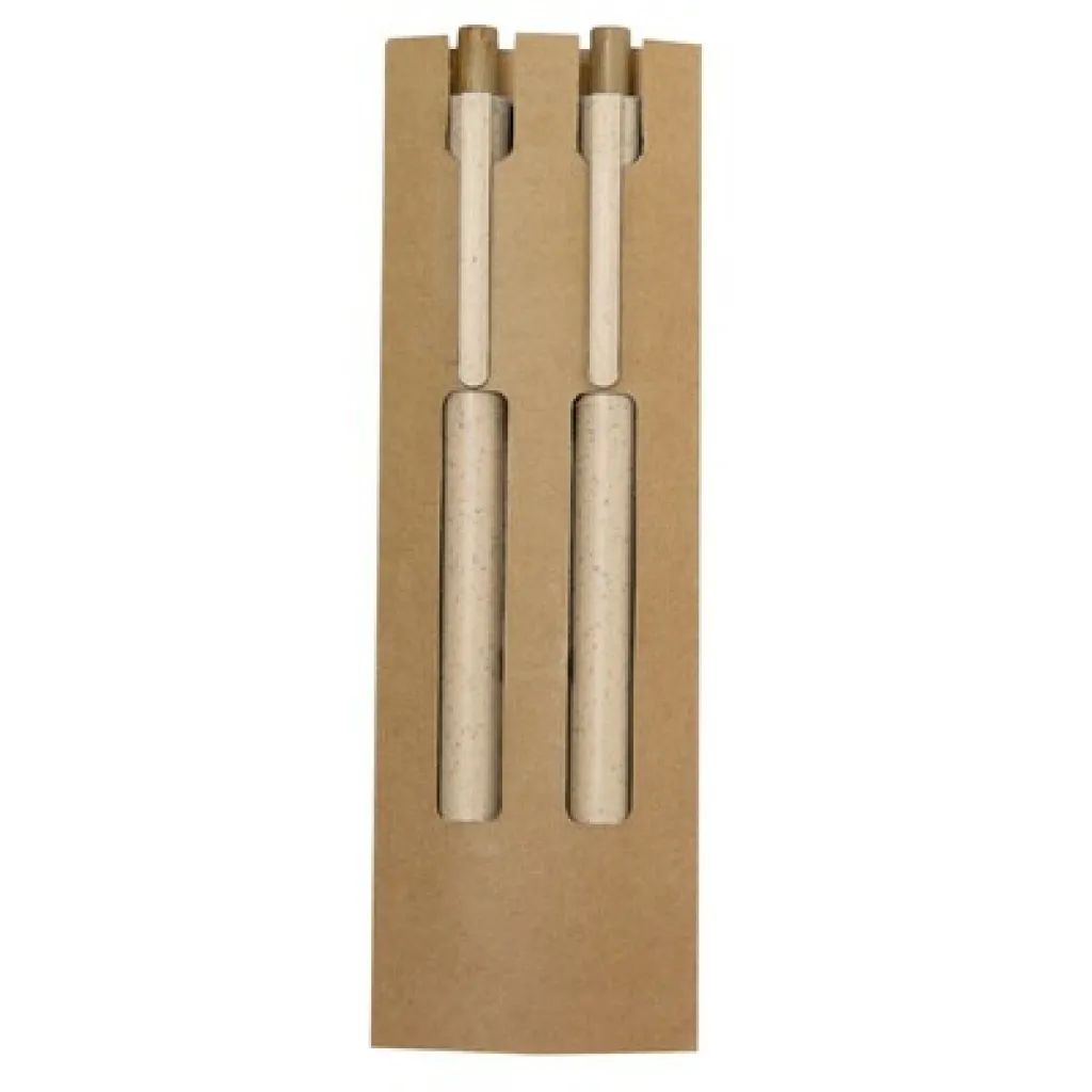 Set kemijske olovke i vječne kemijske olovke od pšenične slame i bambusa. Olovka s mehanizmom za potiskivanje izrađena od bambusa s plavom tintom i odgovarajućom kopčom. Olovka s mehanizmom za guranje izrađena od bambusa s vječnim vrhom, što omogućuje korištenje iste olovke bez stvaranja otpada. Pakirano u kutiji od recikliranog kartona. S tiskanom naljepnicom od pšenične slame. Izrađeno od biljnih materijala za promicanje korištenja prirodnih sirovina i smanjenje emisija zagađivača.