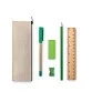 6 dijelni set za radni stol uključuje: futrolu od jute i pamuka, drveno ravnalo, drveno oštrilo, gumicu, papirnu olovku i kartonsku kemijsku olovku s plavom tintom.