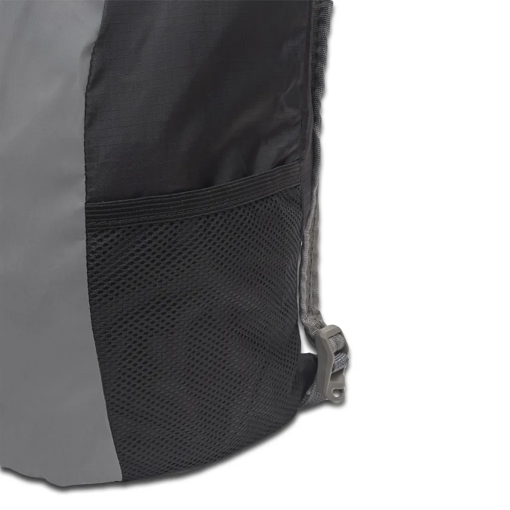 Lagani ruksak sa reflektirajućom prednjom stranom i bočnim džepom. Može se pakirati u malu, kompaktnu vrećicu (9 x 13 cm).