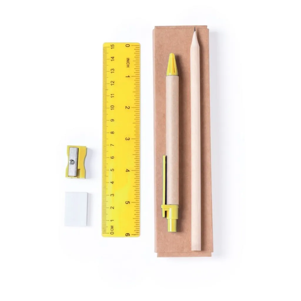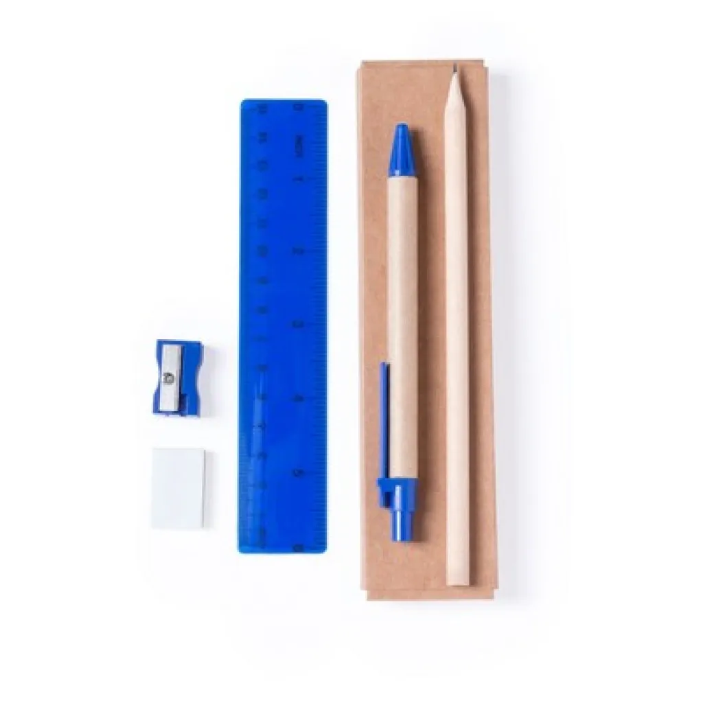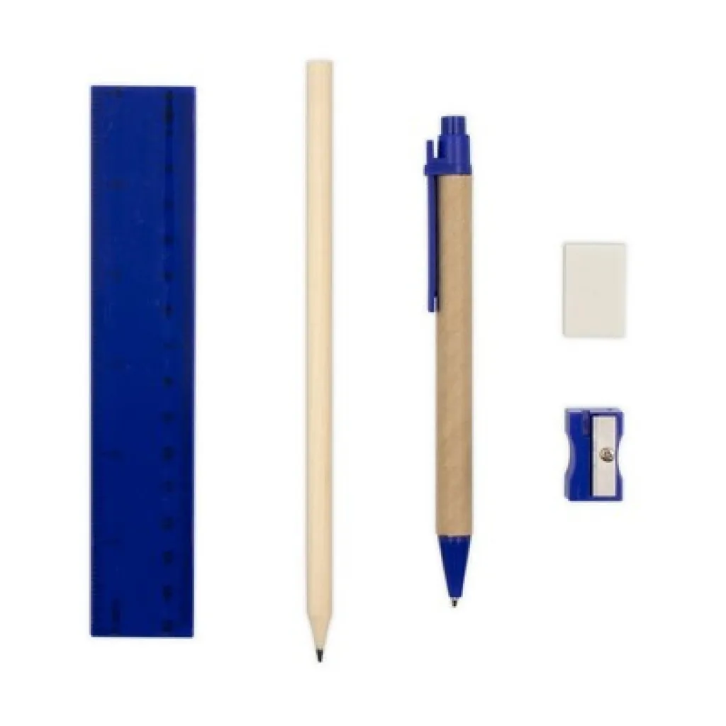 Školski set u kutijici uključuje olovku,kemijsku olovku s cijevi od recikliranog kartona, gumicu za brisanje, šiljilo i ravnalo.