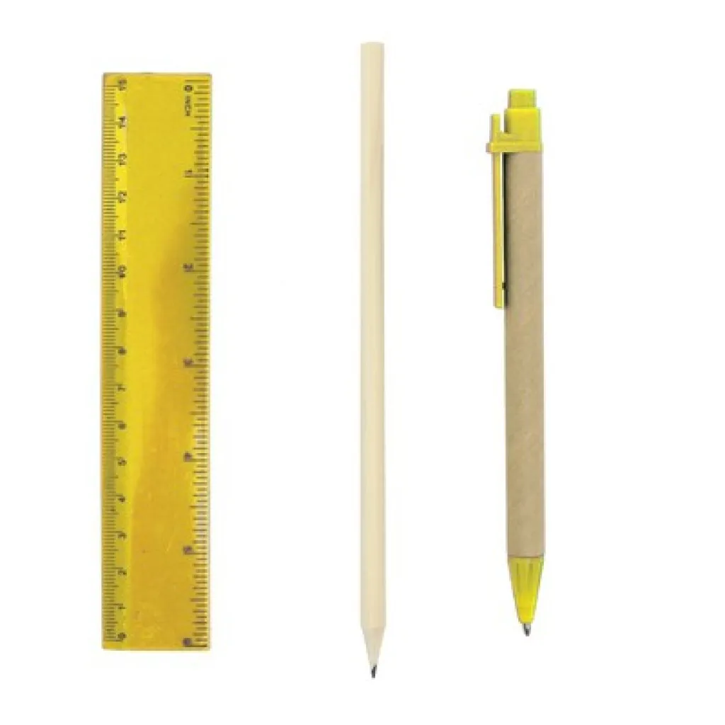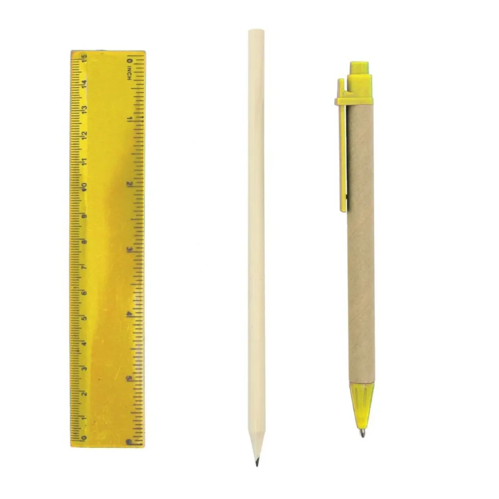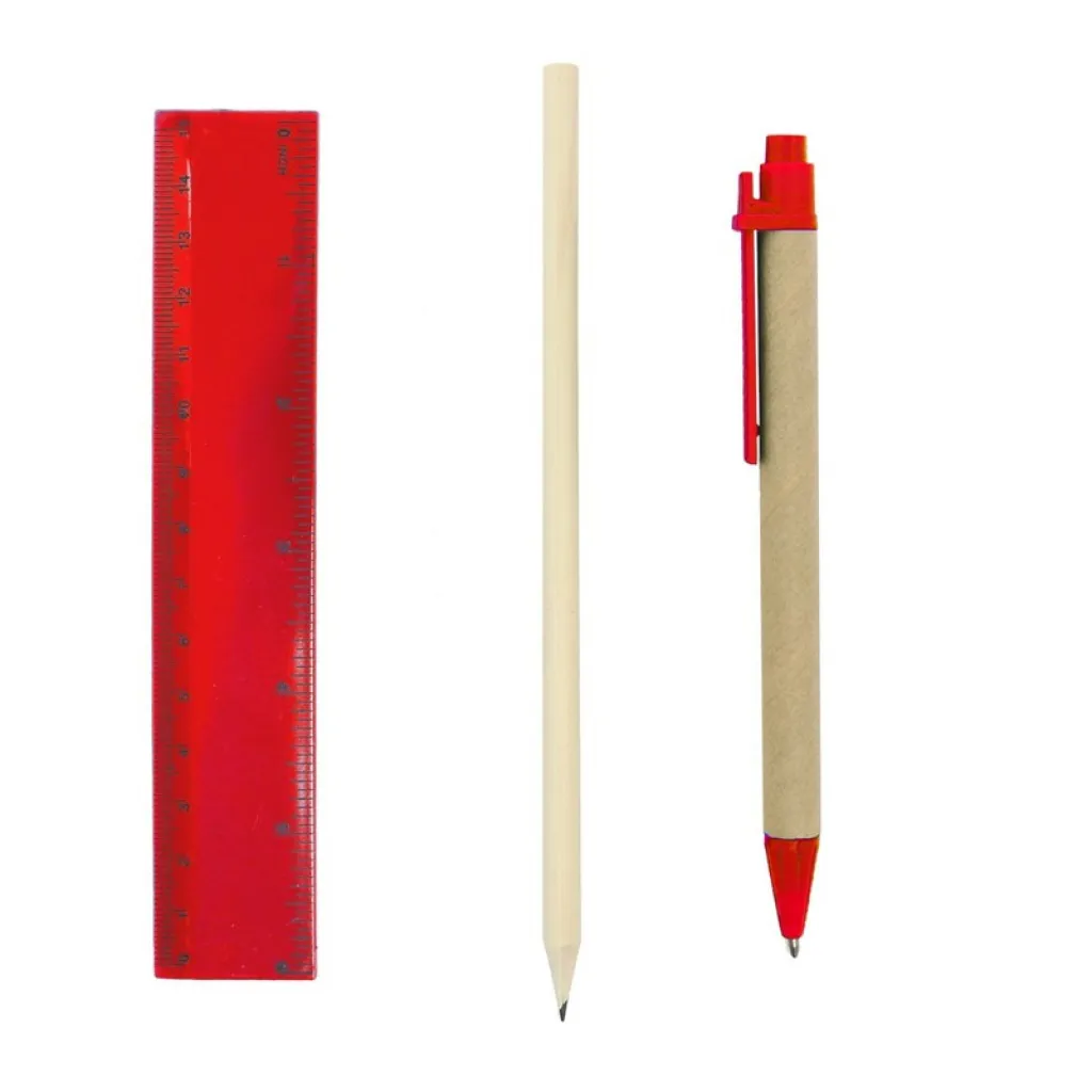 Školski set u kutijici uključuje olovku,kemijsku olovku s cijevi od recikliranog kartona, gumicu za brisanje, šiljilo i ravnalo.