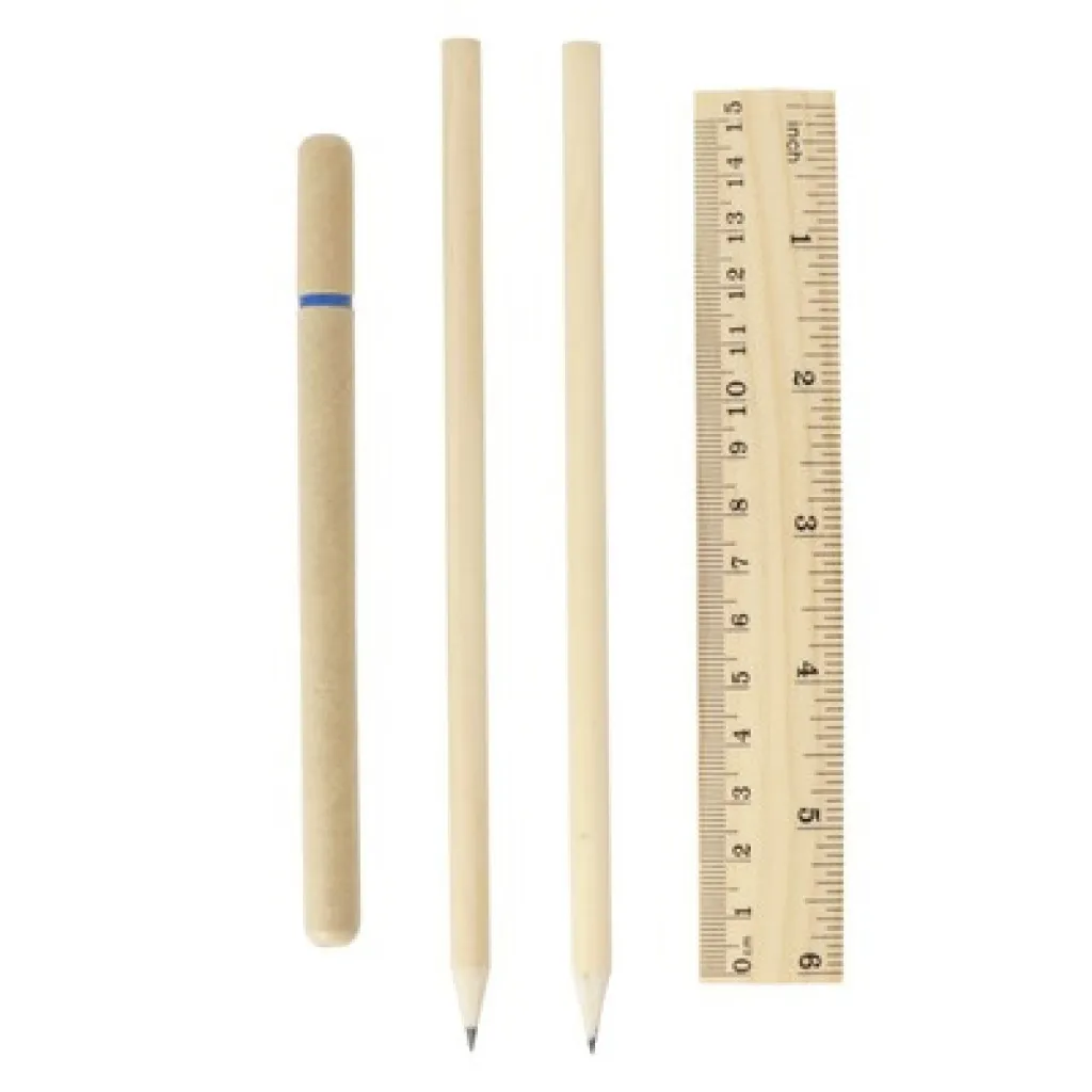 Školski set, bilježnica (cca. A5, 70 praznih listova), pernica s patentnim zatvaračem, kemijska olovka od recikliranog kartona, 2 olovke, ravnalo, šiljilo i gumica.