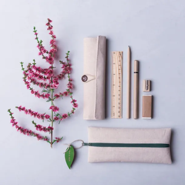Školski set u eko pernici s patentnim zatvaračem unutar koje su olovka (nenaoštrena), kemijska olovka, ravnalo, gumica za brisanje i šiljilo.