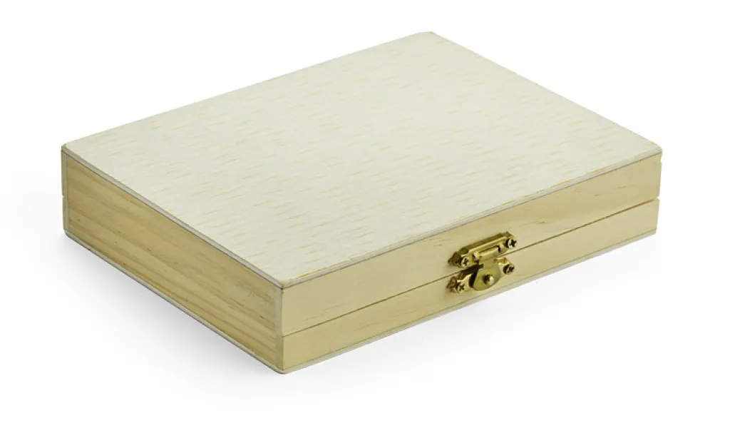 Praktičan set u drvenoj kutiji sadrži: olovku, gumicu, šiljilo, pastelne bojice, boje i kist. Mogućnost dotiska loga na kutiju.