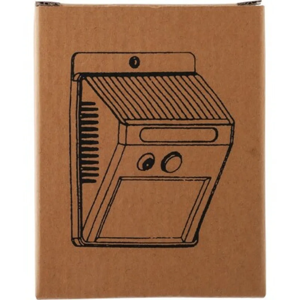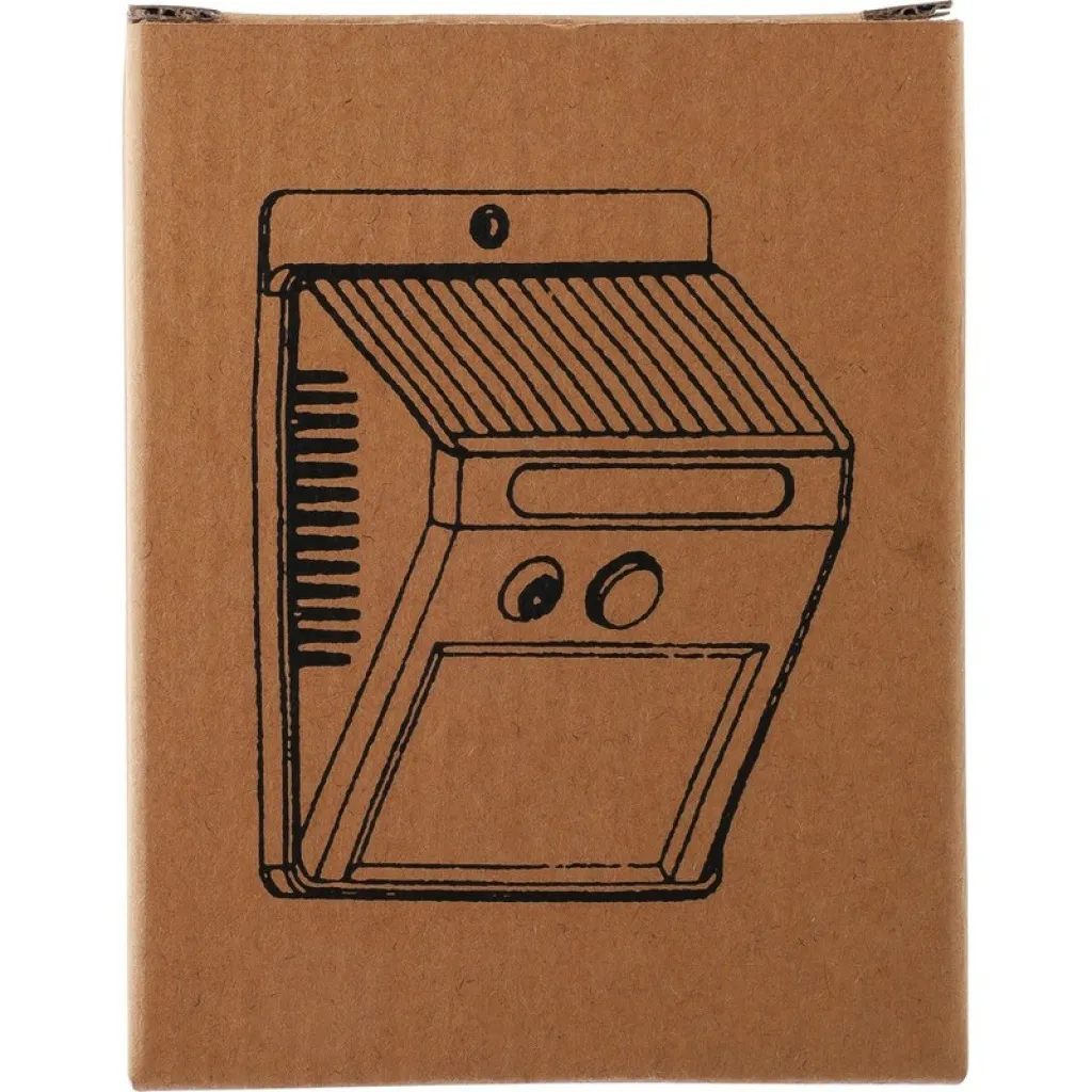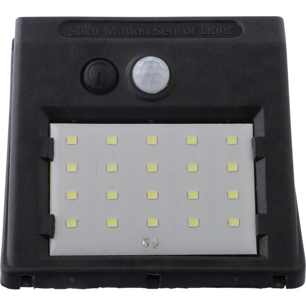 Solarna zidna svjetiljka sa 20 COB LED dioda, ima noćni senzor (CDS) i senzor pokreta (PIR), kapacitet baterije 800 mAh, uključuje kabel za punjenje, IP44 zaštitu, funkcije stalnog i treptajućeg svjetla, pojedinačno pakirana u smeđu kartonsku kutiju, proizvod izrađen od PP materijala.