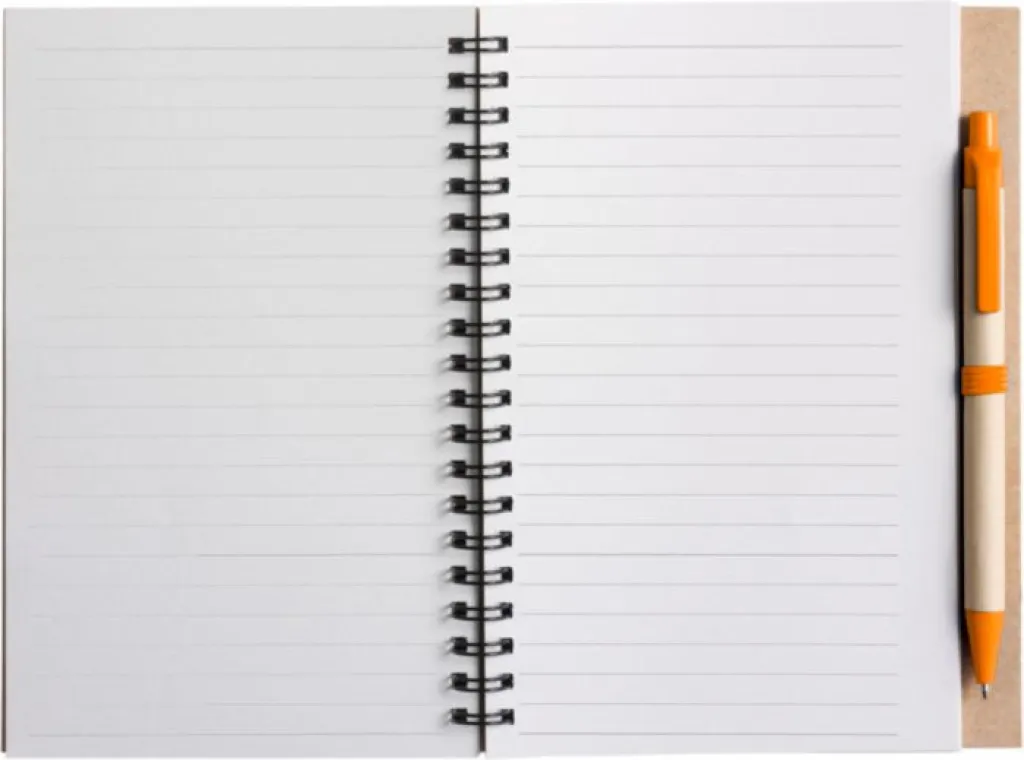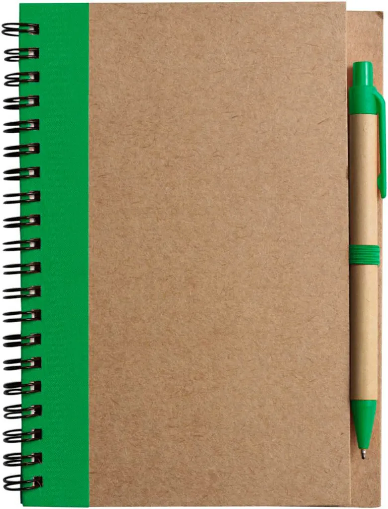 Bilježnica/Notes od recikliranog kartona, uvezana žicom sa 60 stranica s crtama i kemijskom olovkom s biorazgradivim dijelovima i plavom tintom. 100% reciklirani papir.