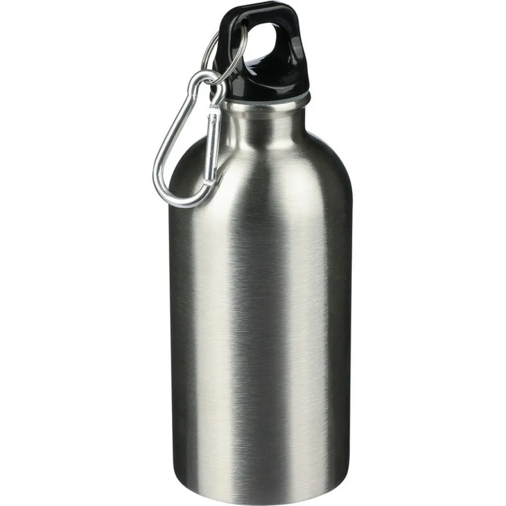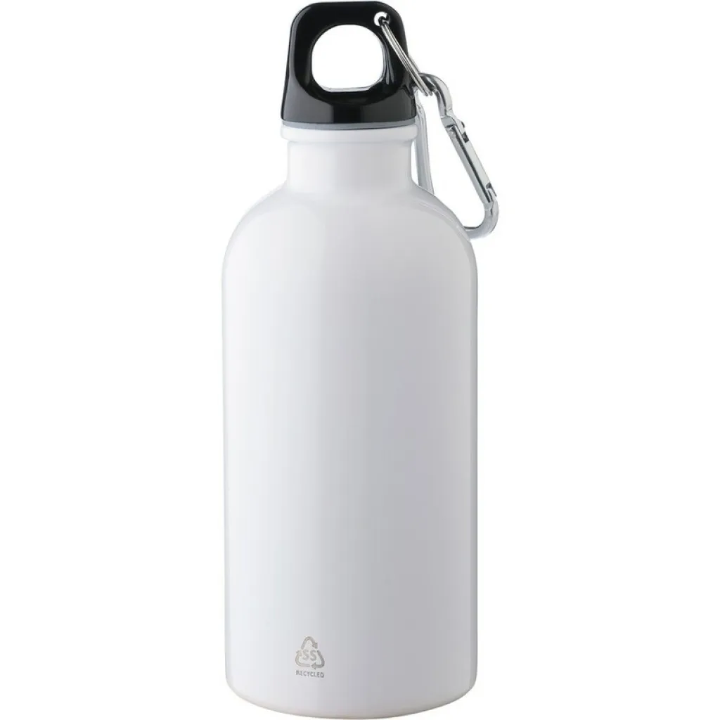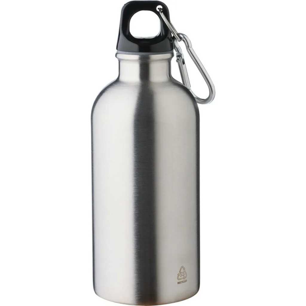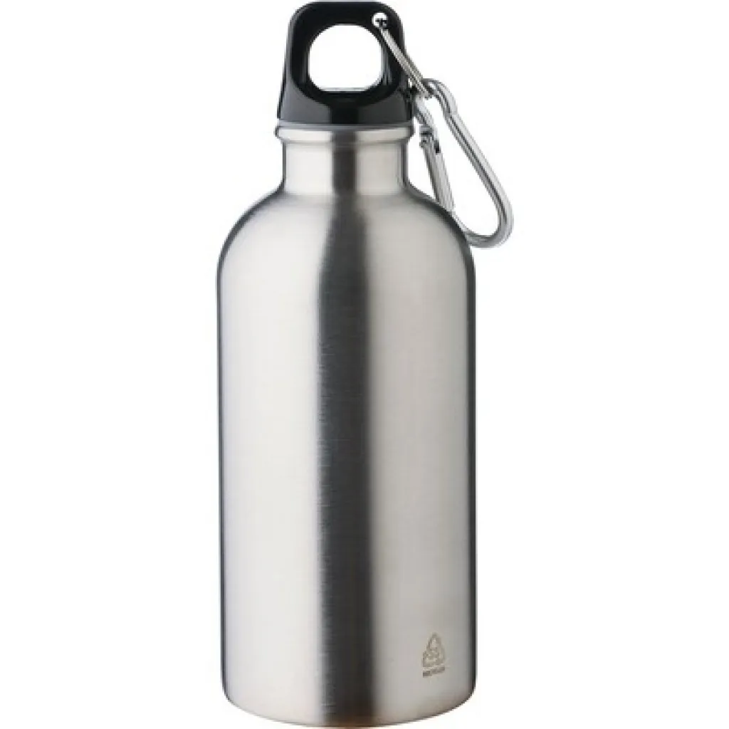 Sportska boca 400 ml, uključuje recikliranu ikonu na proizvodu, ne može se prati u perilici posuđa, proizvod je izrađen od recikliranog nehrđajućeg čelika, PP poklopac, srebrni aluminijski karabiner