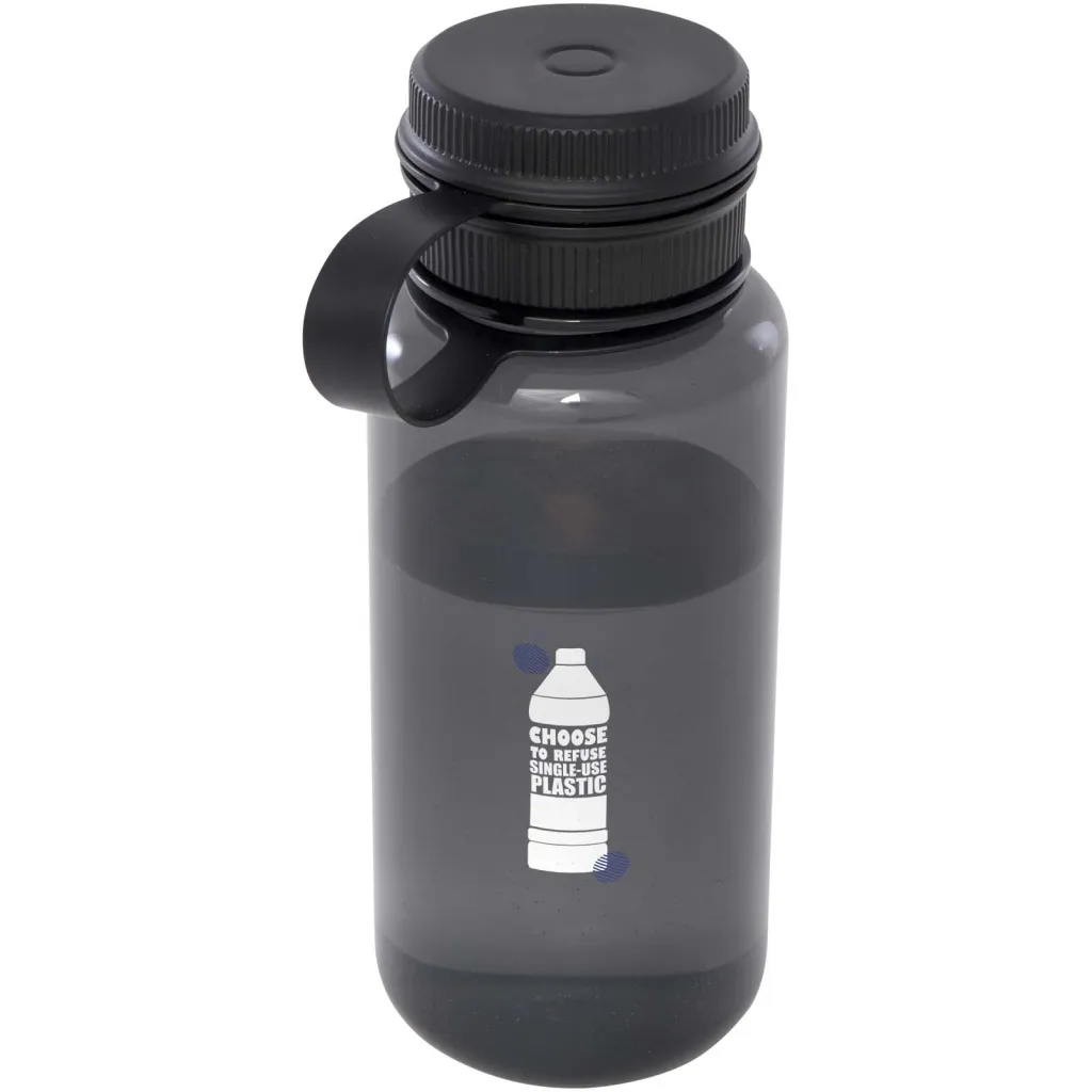 Sportska boca s jednom stijenkom, izrađena od RPET materijala s RCS certifikatom, s poklopcem na zavrtanje i nepropusnim zatvaračem koji ima praktičnu ručku integriranu u poklopac. Konstrukcija s dva otvora omogućuje jednostavno čišćenje i punjenje. U skladu je s EFSA-ovim (Europska agencija za sigurnost hrane) odobrenim procesom recikliranja PET materijala. Kapacitet: 900 ml.