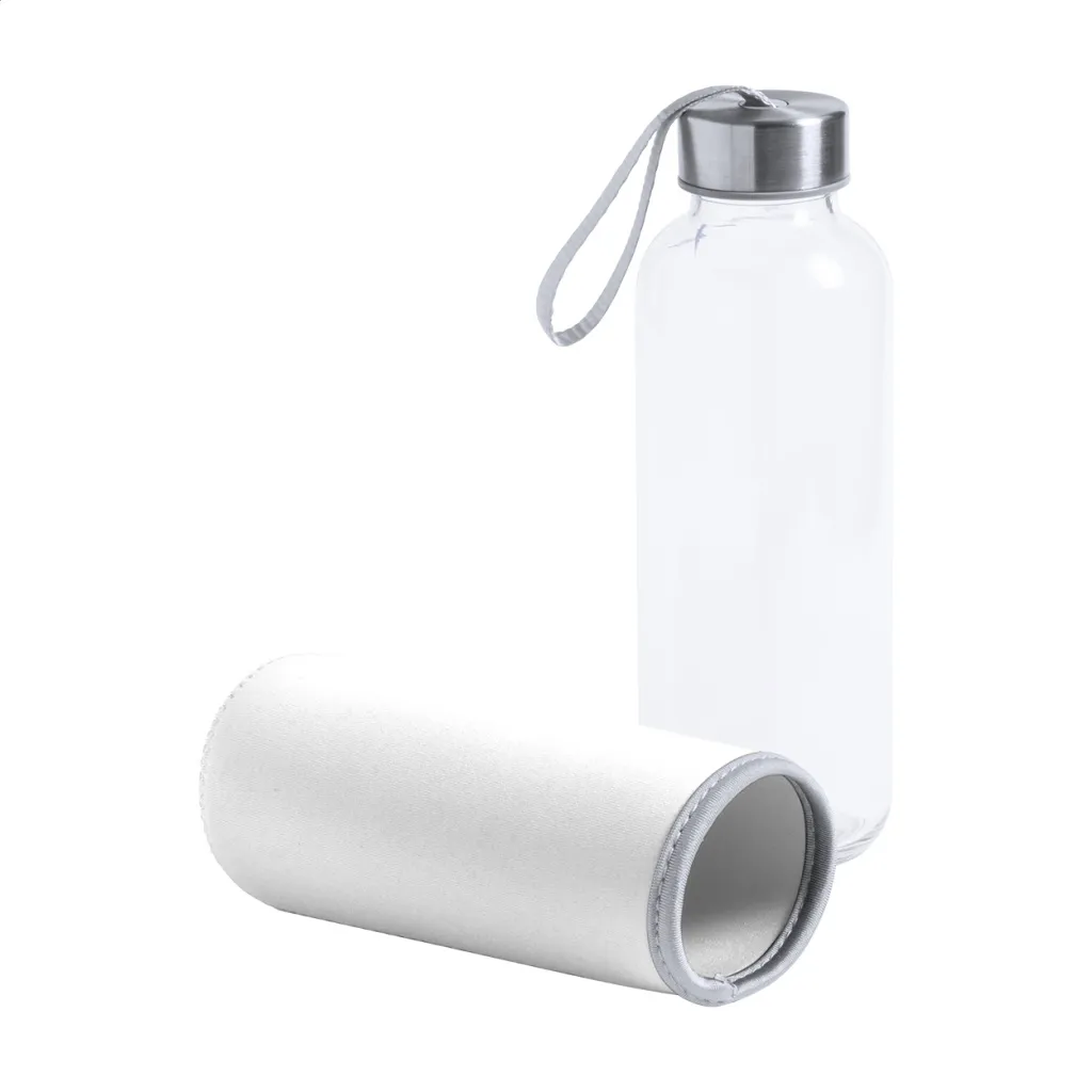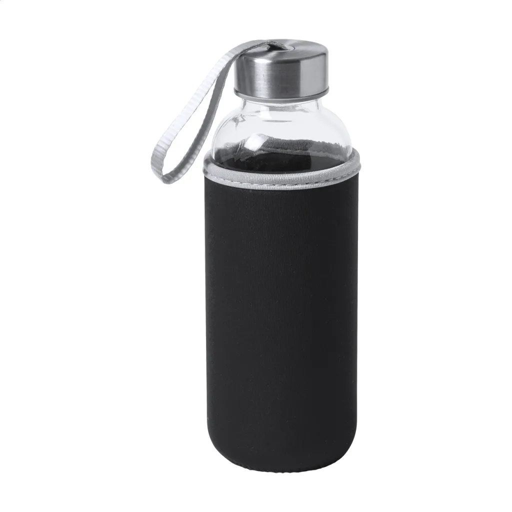 Sportska staklena boca za vodu s vezicom za nošenje na poklopcu i neoprenskom navlakom u boji. Zapremina 400 ml.