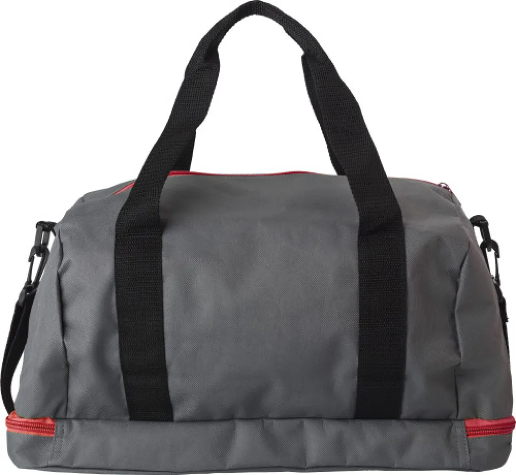 Mala sportska torba od 600D poliestera s jednim džepom s patentnim zatvaračem i zasebnim pretincem za cipele na dnu. Torba ima dvije ručke i podesivu naramenicu.