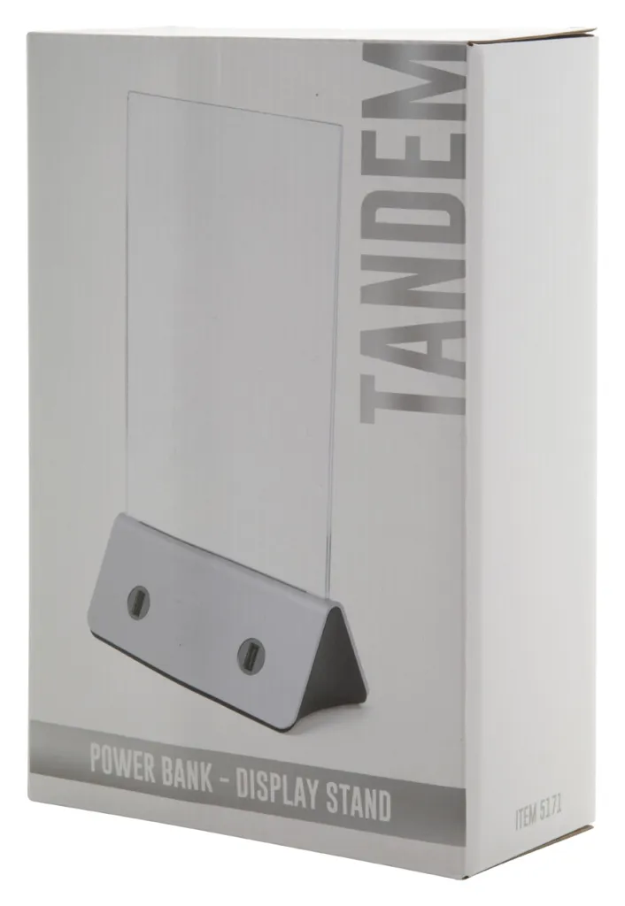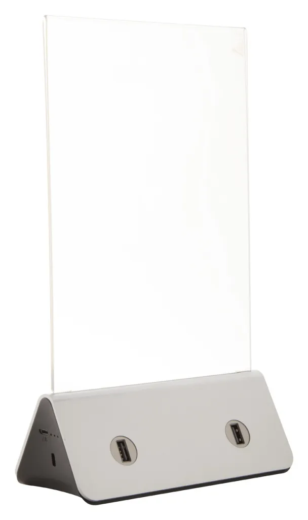 Stalak za cjenike od pleksiglasa s ugrađenim prijenosim punjačem od 10000 mAh s 4 ulaza. Uključuje micro USB kabel.