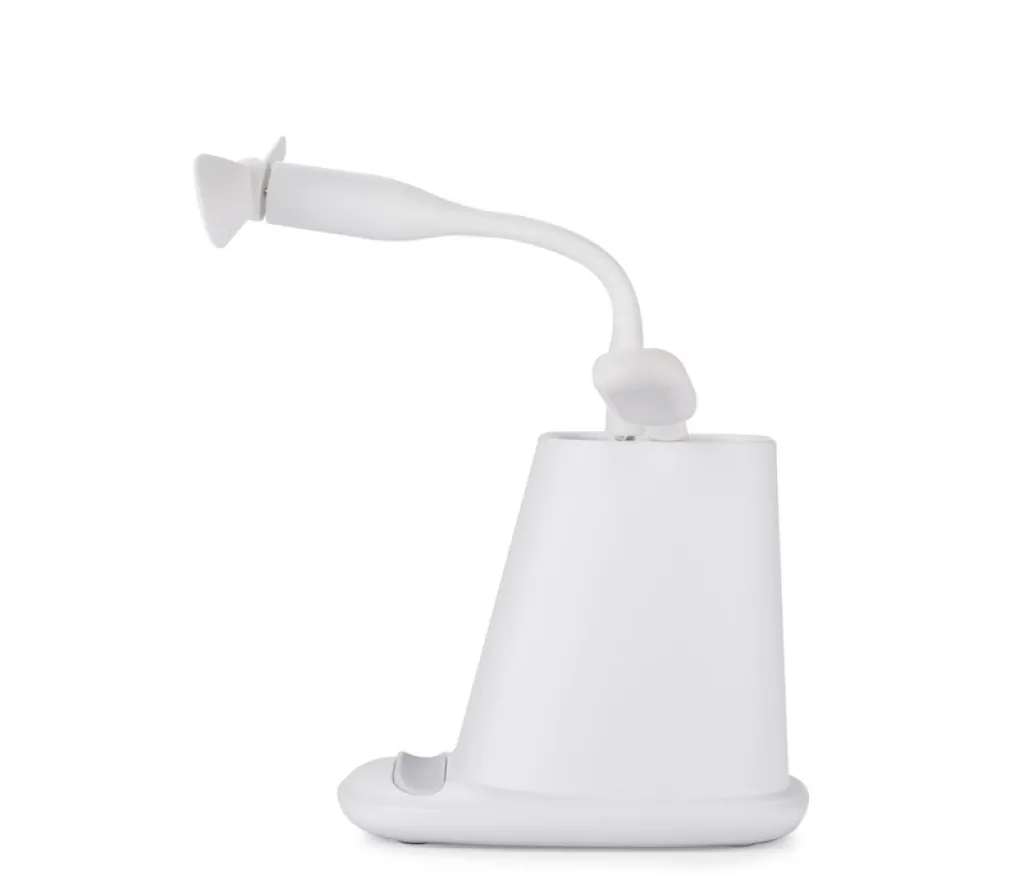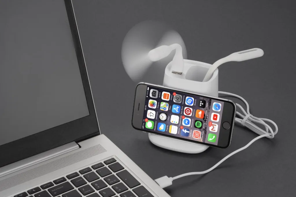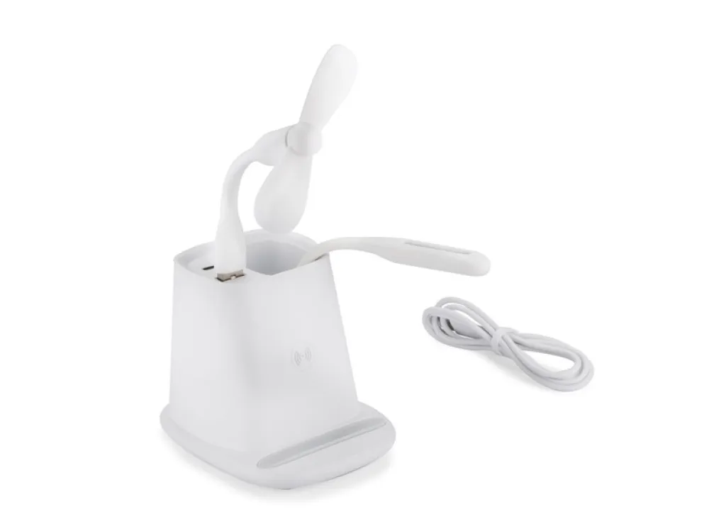 BERGO stolni dodatak je savršeni stolni uređaj za rad. Ima ugrađeni bežični punjač, koji služi i kao stalak za mobitel, jedan USB priključak koji služi za napajanje dodataka koji su uključeni u proizvod: ventilator ili lampu, te USB tip C priključak za punjenje mobitela odgovarajućim kabelom. Kad ne koristite dodatnu opremu, USB priključak može funkcionirati kao čvorište. Specifikacije: USB tip C ulaz: 5V/2A, izlaz bežičnog punjača: 5W, 2 izlaza: USB tip A i USB tip C: 5V/2A (maks.).