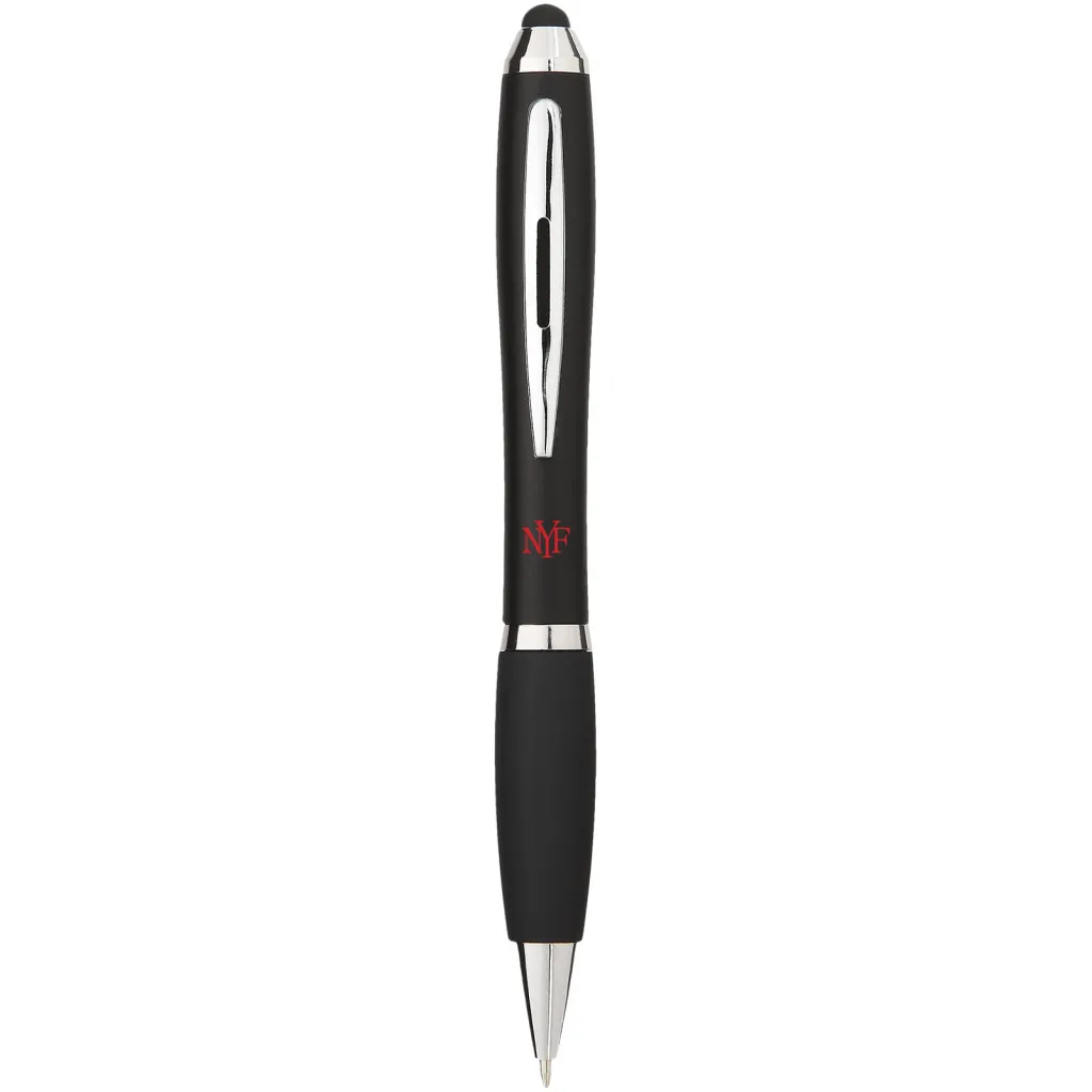 Kemijska olovka s nastavkom za ekrane osjetljive na dodir, crnom drškom i okretnim mehanizmom paljenja. Crna tinta.