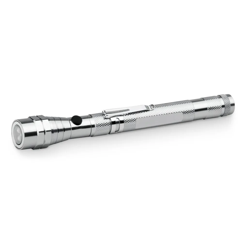 Metalna teleskopska LED svjetiljka s 3 LED diode, magnetom i klipsom. Uključuje 4 LR44 litijeve baterije. Dimenzije: ø22 x 175 mm