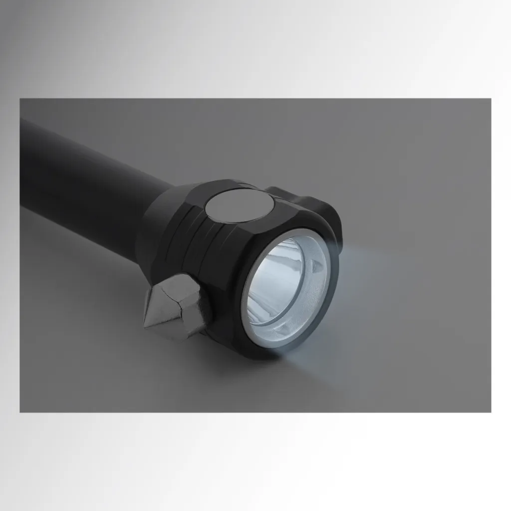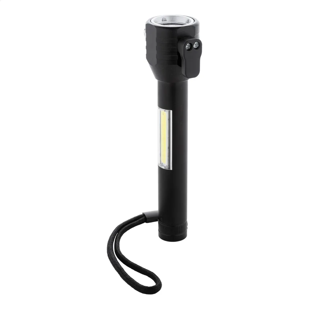3u1 aluminijska svjetiljka s čekićem za hitne slučajeve i rezačem sigurnosnog pojasa. S ugrađenom USB punjivom baterijom (500 mAh), magnetom i remenom za nošenje. S COB svjetlom velike snage na fontu i COB reflektorom sa strane. Uključuje USB kabel za punjenje.