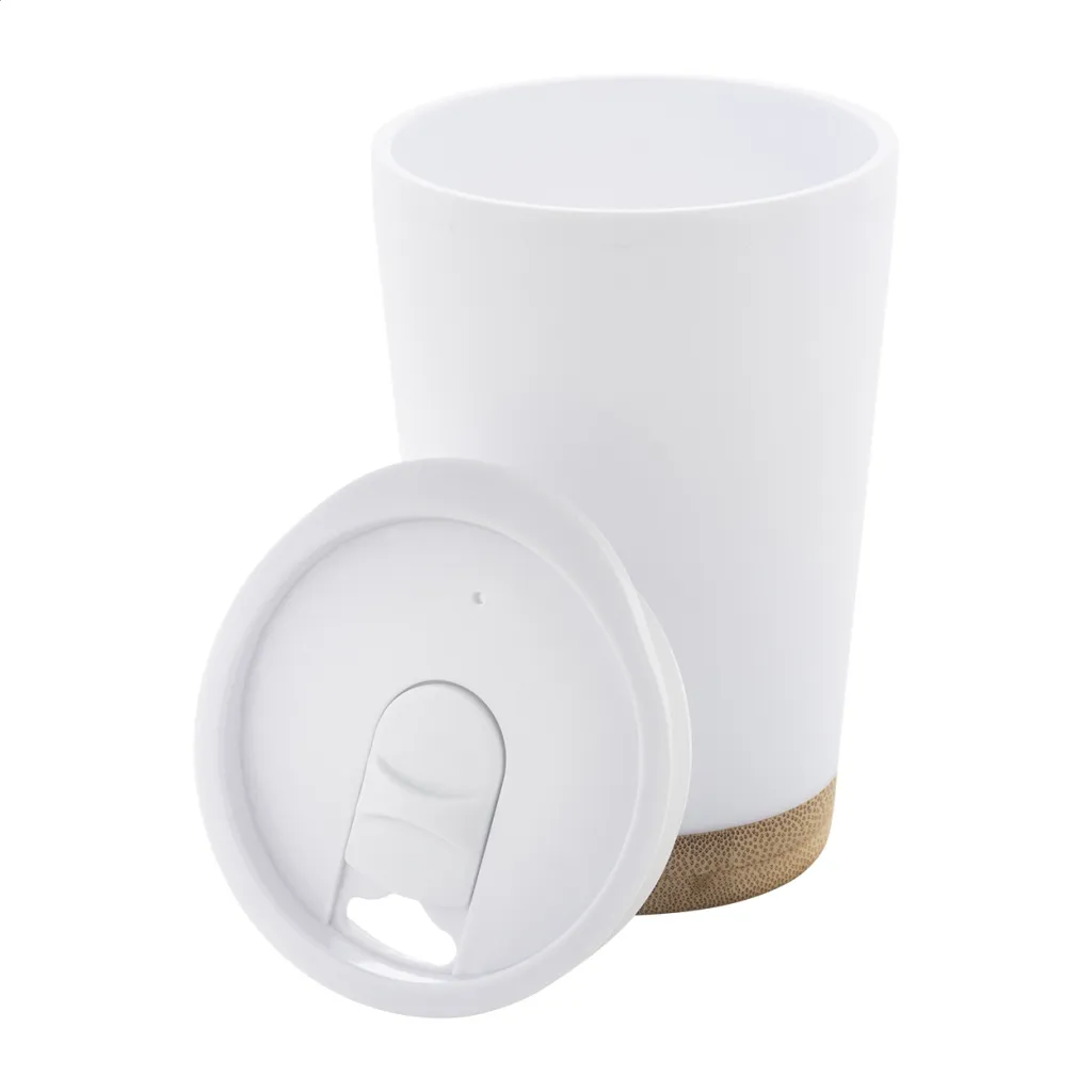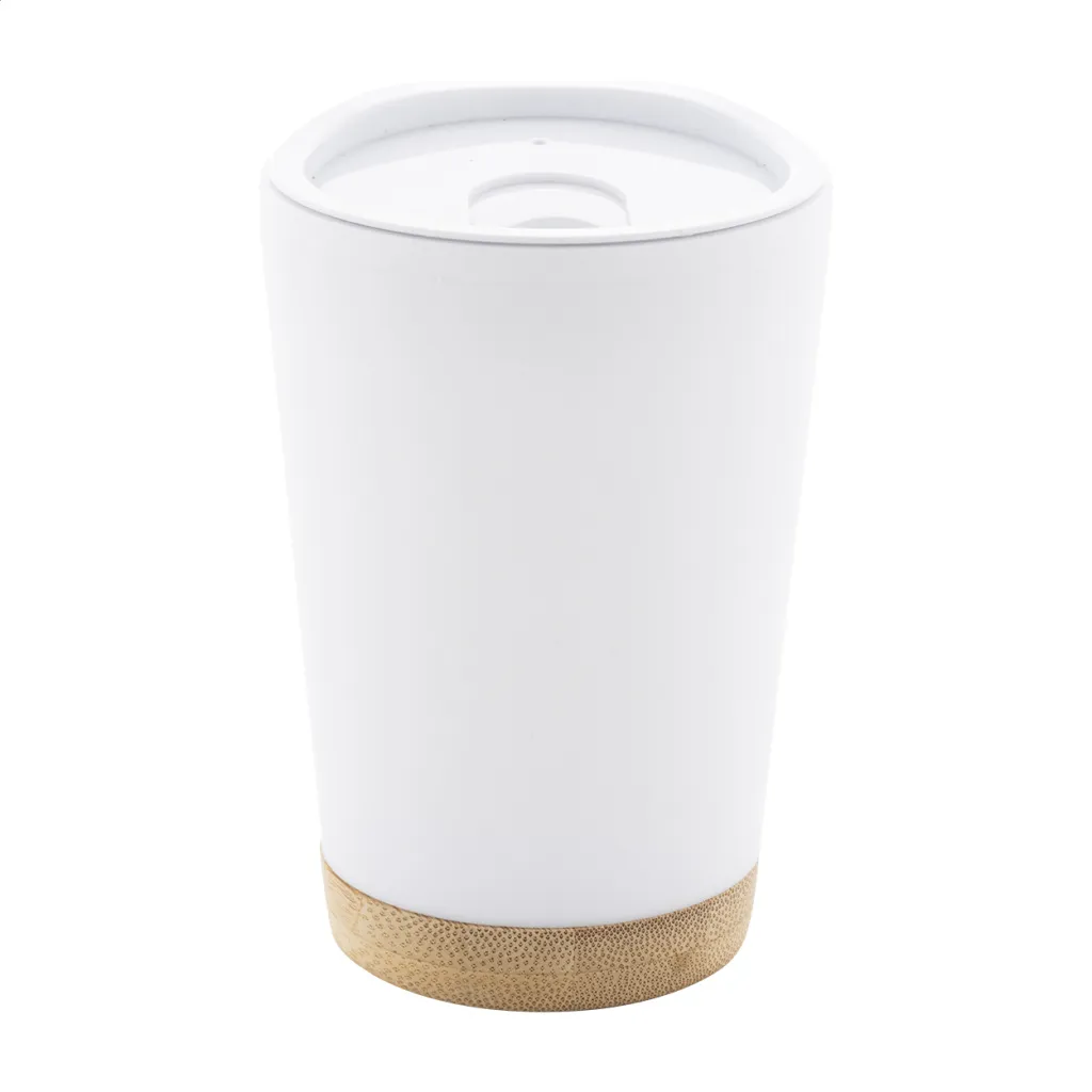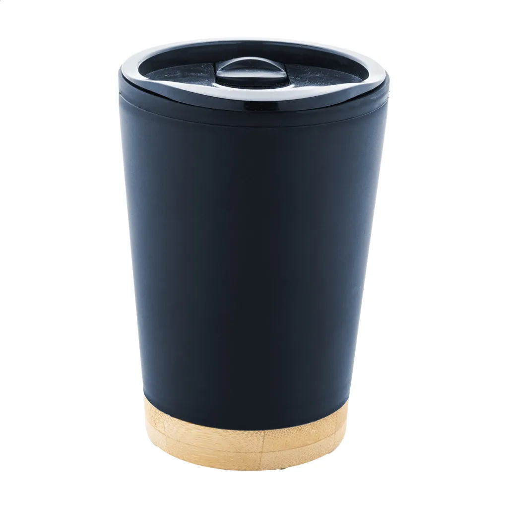 Termo šalica s dvostrukom stijenkom, izolirana PP plastikom, s poklopcem za piće i dnom od bambusa. Kapacitet: 260 ml.