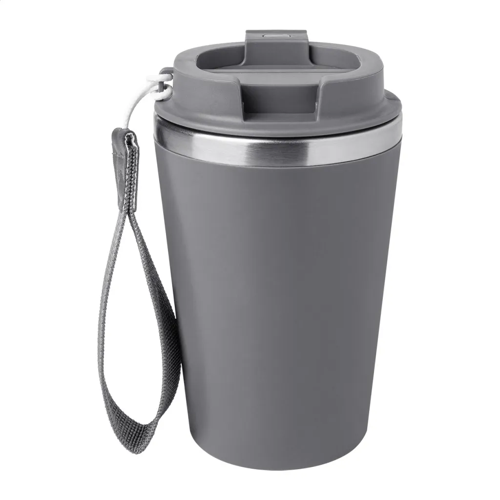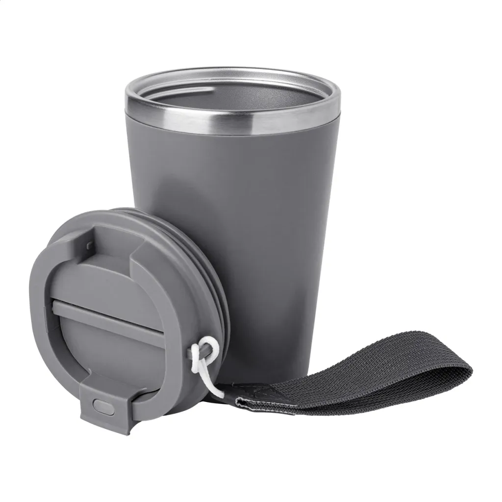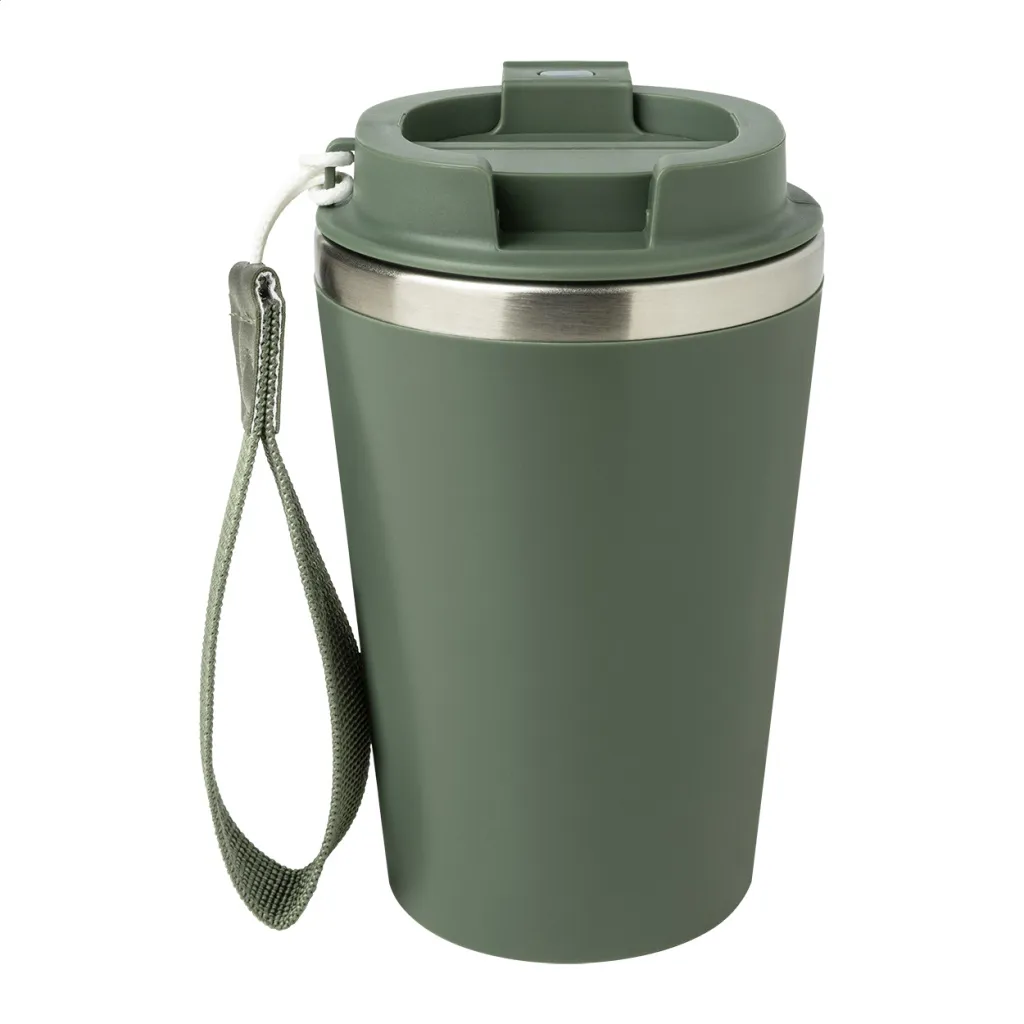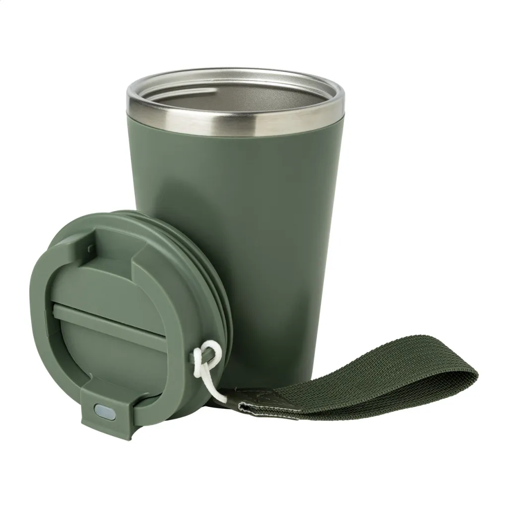 Termo šalica s dvostrukom stijenkom, izolirana od recikliranog nehrđajućeg čelika s PP plastikom izvana i poklopcem za piće. S RPET trakom za nošenje. Kapacitet: 350 ml.