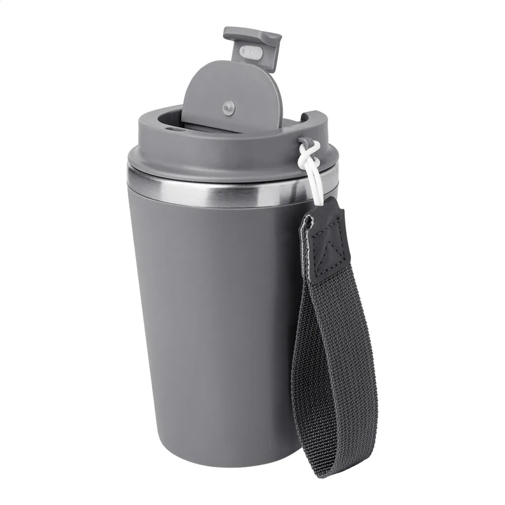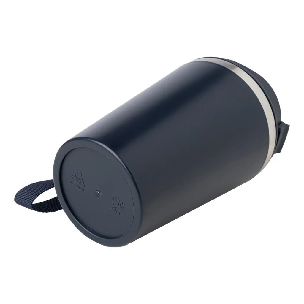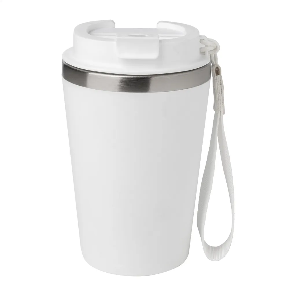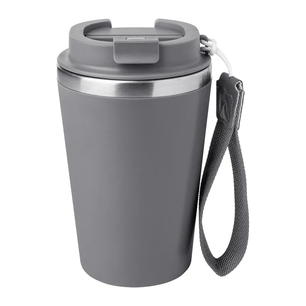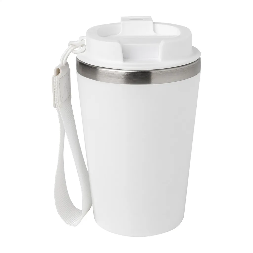 Termo šalica s dvostrukom stijenkom, izolirana od recikliranog nehrđajućeg čelika s PP plastikom izvana i poklopcem za piće. S RPET trakom za nošenje. Kapacitet: 350 ml.