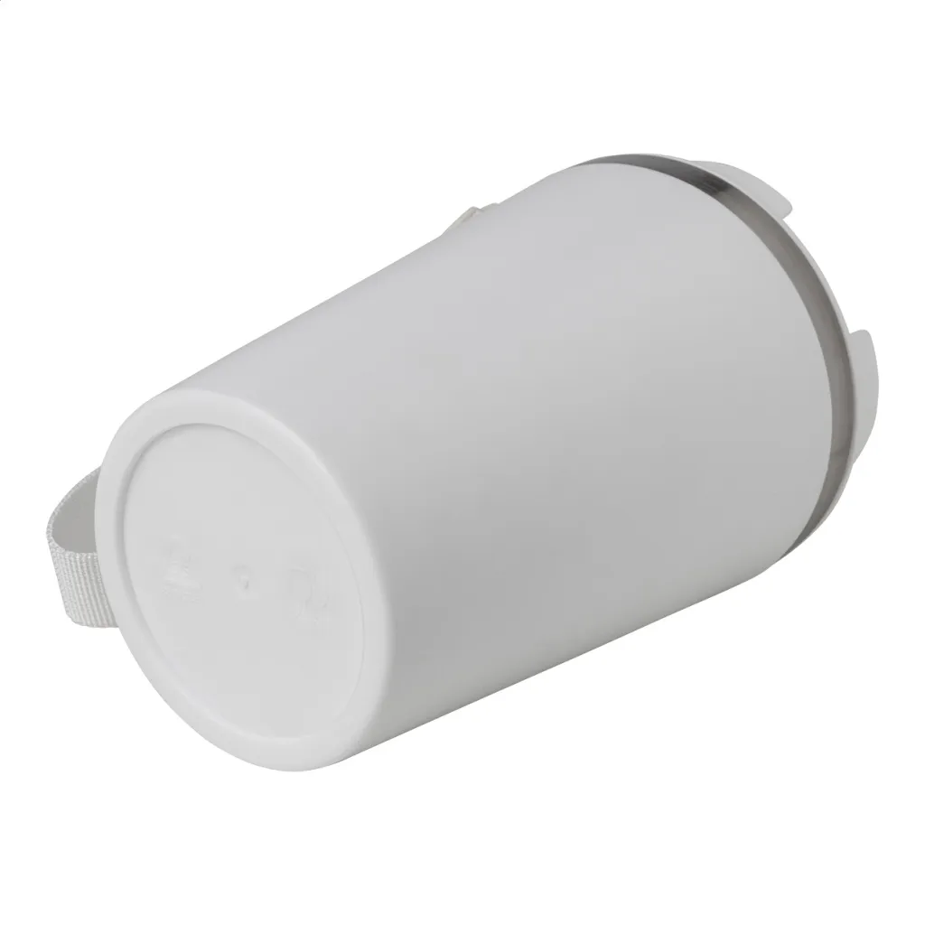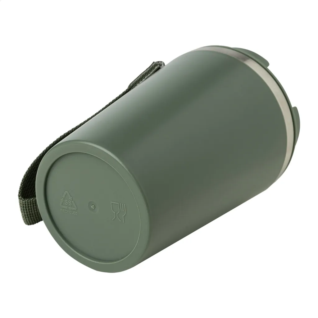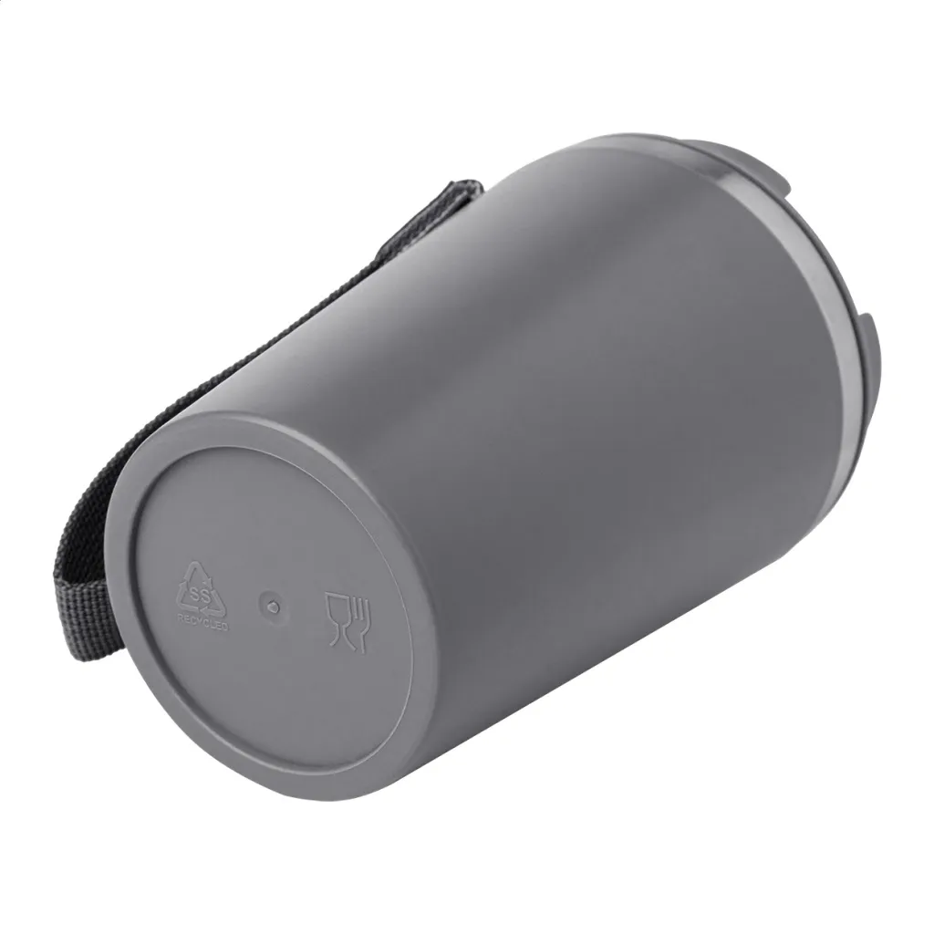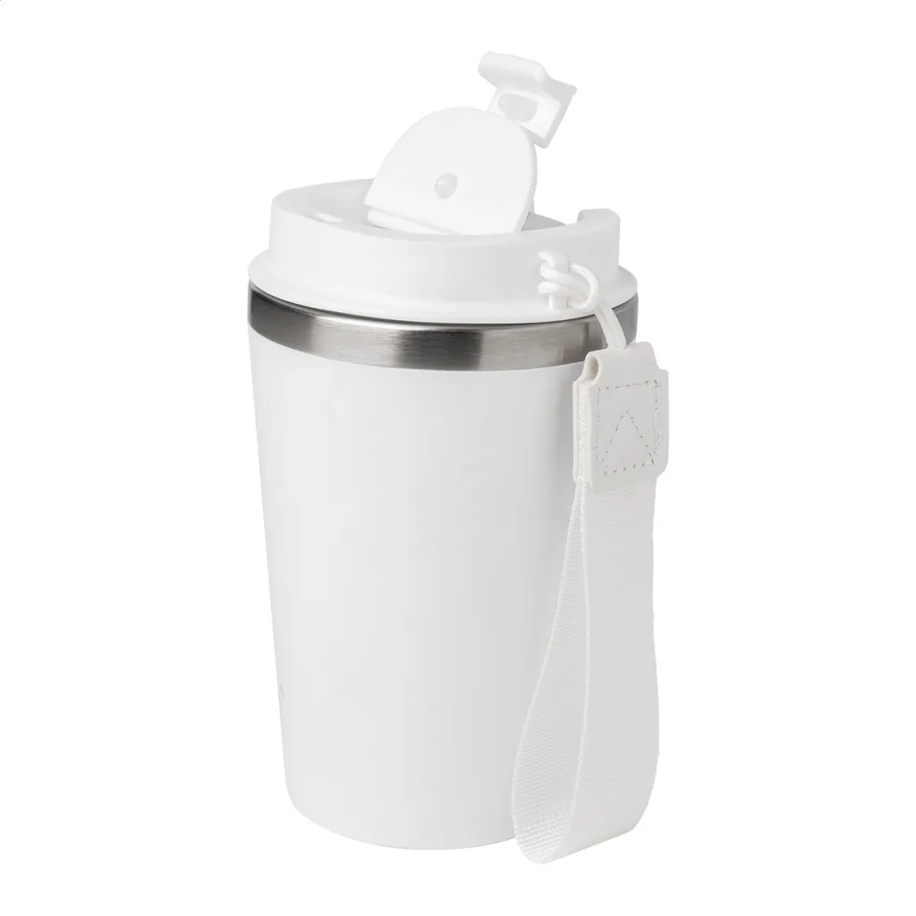 Termo šalica s dvostrukom stijenkom, izolirana od recikliranog nehrđajućeg čelika s PP plastikom izvana i poklopcem za piće. S RPET trakom za nošenje. Kapacitet: 350 ml.