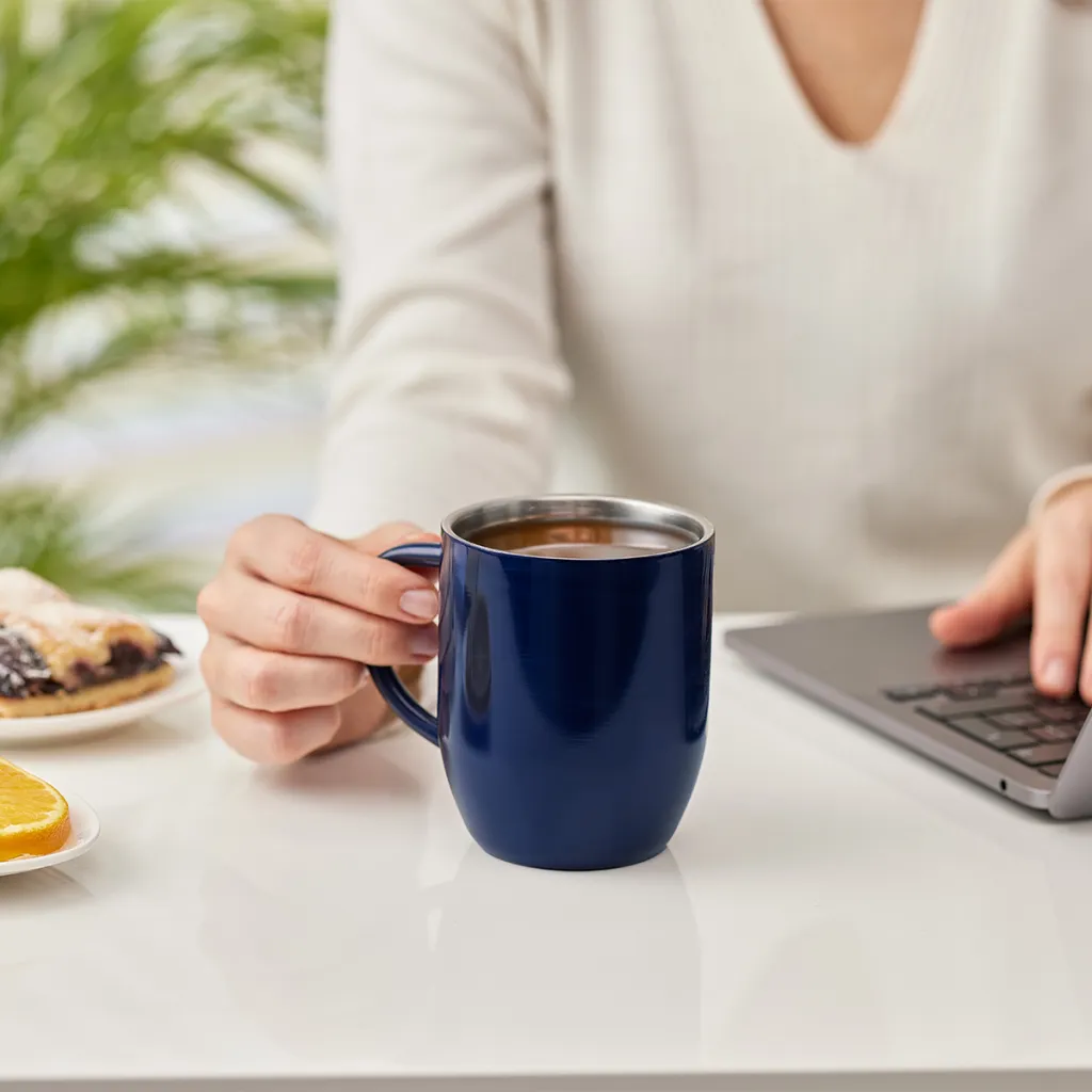 Šalica od 380 ml izrađena od nehrđajućeg čelika 18/8 s ručkom i površinom u sjajnom laku.