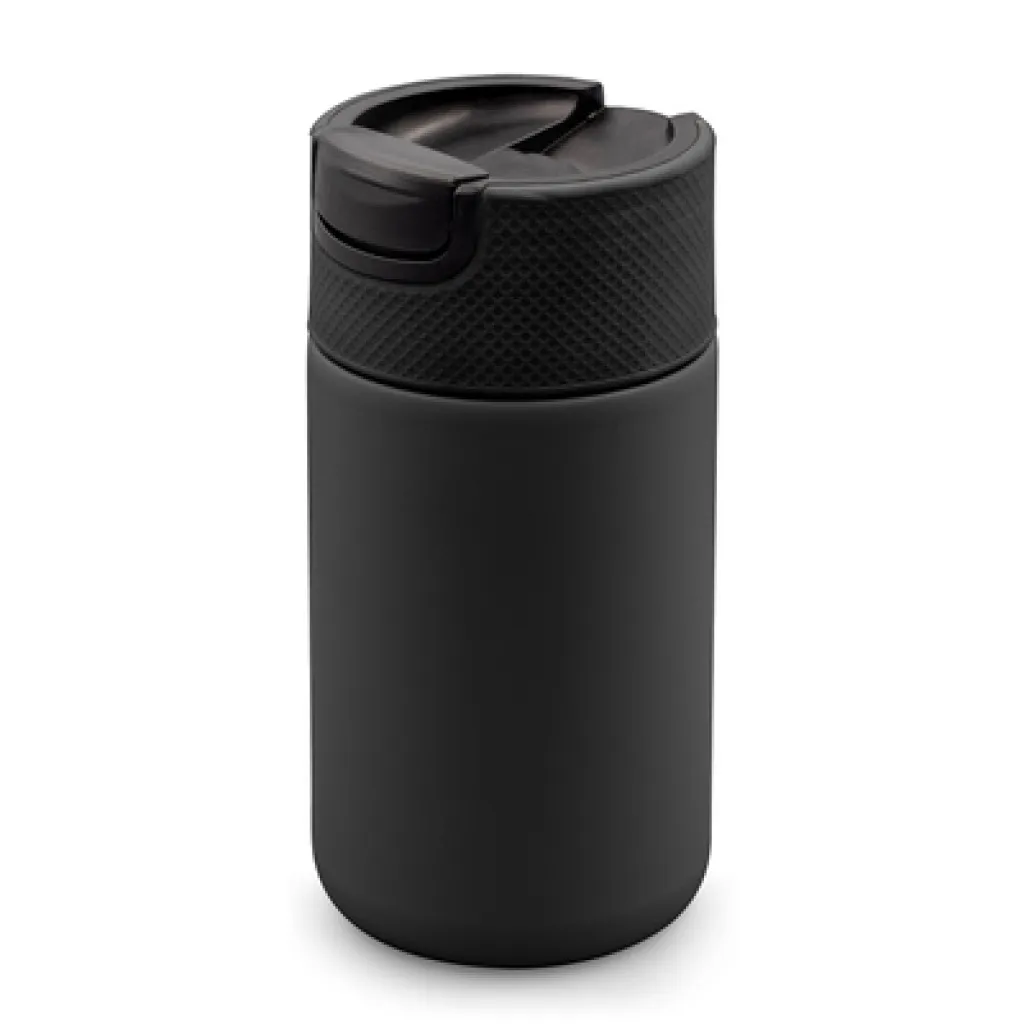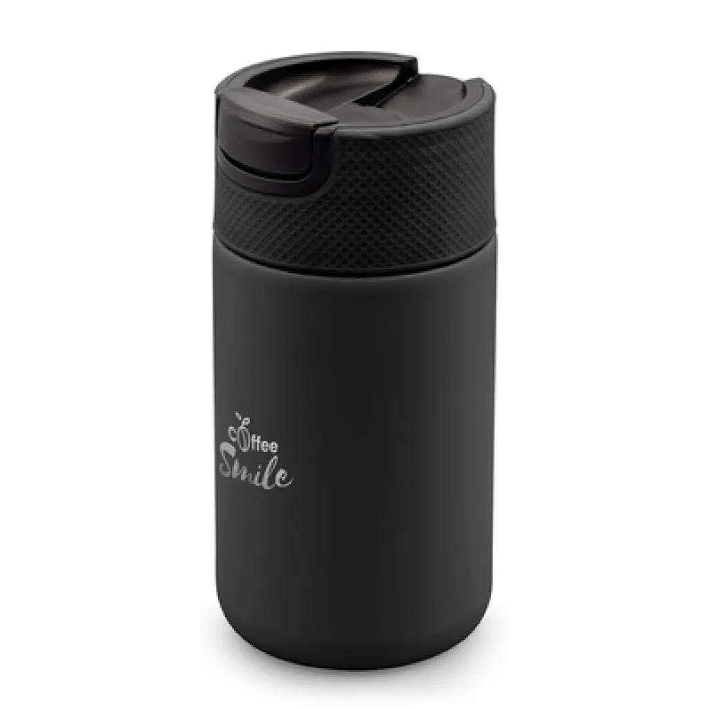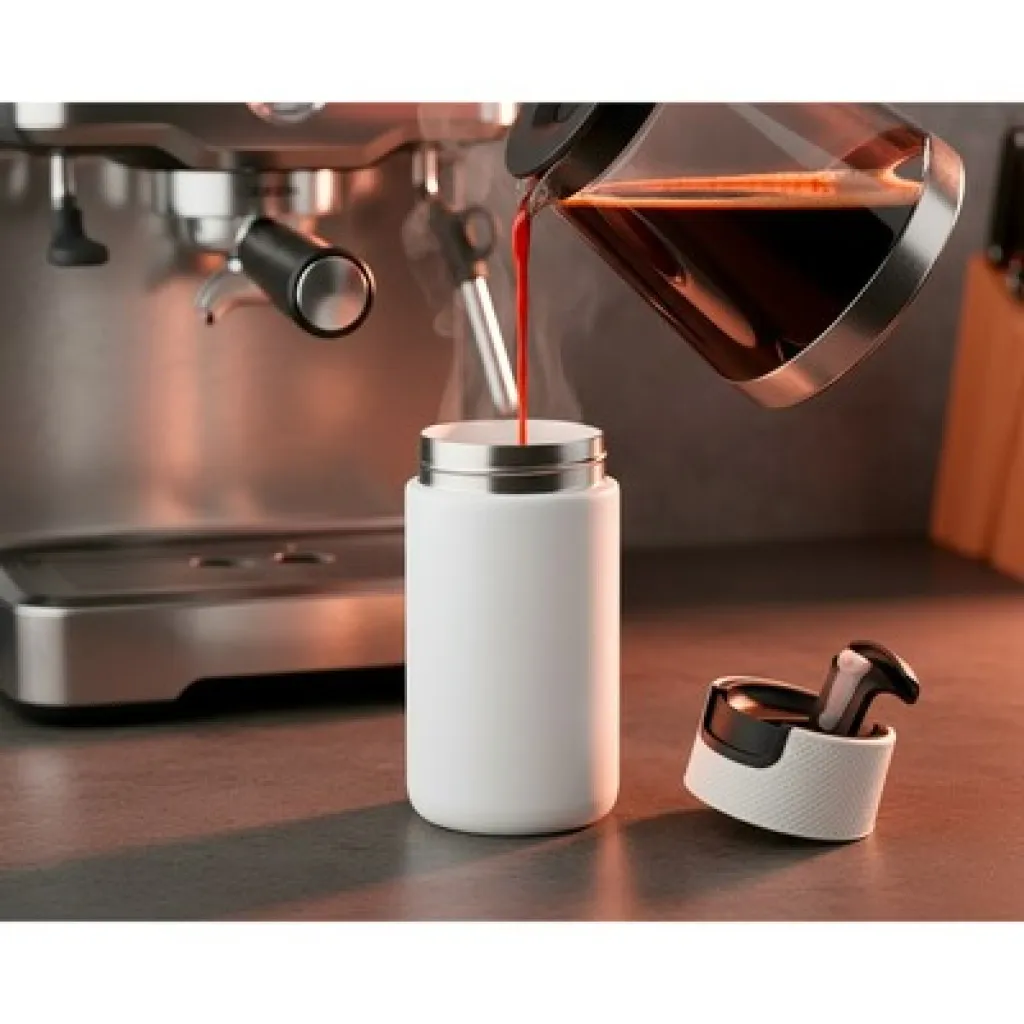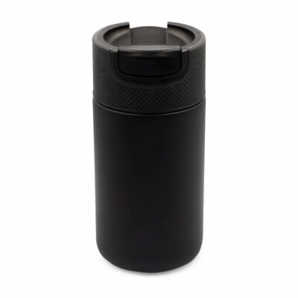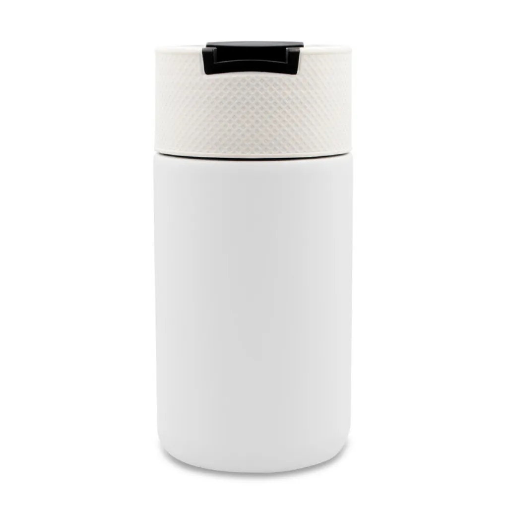 Air Gifts termo šalica 400 ml s dvostrukim stijenkama od nehrđajućeg čelika i keramike te vakuumskom izolacijom koja usporava gubitak temperature, djelujući poput termosa. Opremljena plastičnim poklopcem s mehanizmom za zatvaranje koji omogućuje upotrebu jednom rukom. Mat završna obrada. Proizvod izrađen od metala, keramike i plastike. Klasa toplinske izolacije: C + nepropusna.